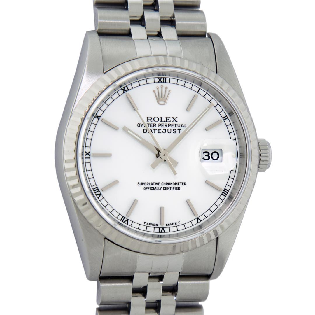 One Mens Pre Owned Rolex Stainless Steel Datejust Polished Bright with Satin Finish, Serviced & Electronically Tested, Rolex Stainless Steel Case: 36mm, Rolex Stainless Steel Crown, Rolex Bezel: 18K White Gold Fluted Bezel. Crystal: Sapphire With Cyclops Lens. Rolex Movement: Automatic Winding Movement Caliber 3135. Rolex Dial: White Index With Roman Square Track. Hands: White Lumi Hands. Date Window: 3 O'Clock Position Date Display, Quickset, Model: Quickset Datejust. Condition: G-6 Extra Fine. Rolex Bracelet: Stainless Steel Jubilee Band. Bright Polish & Satin Finish. 7.0 Inch Length, Adjustable. Standard Clasp, With Rolex Logo. This Pre Owned Watch Has Been Serviced Time Tested And Is In Excellent Condition It Is Free Of All Scratches And Dents.