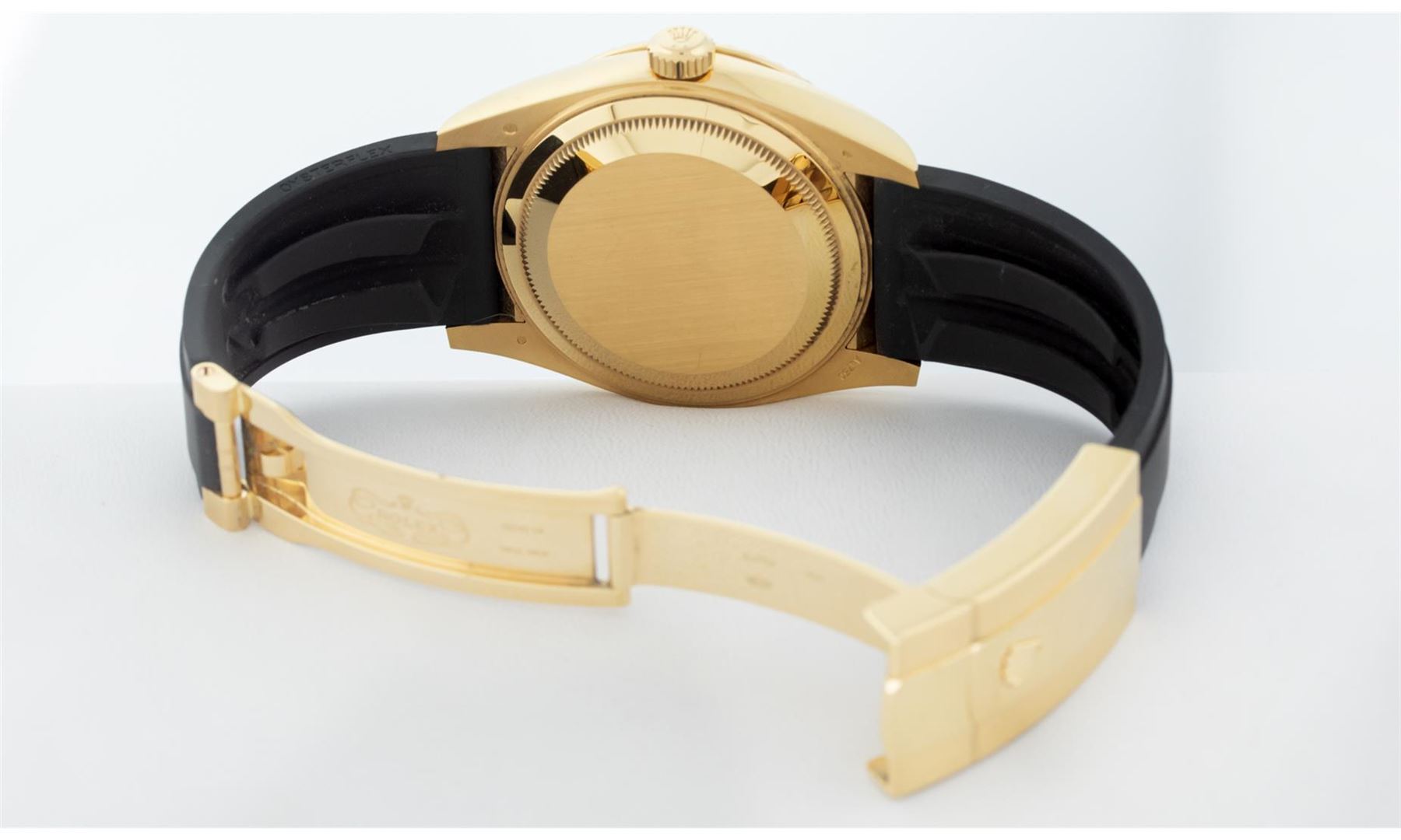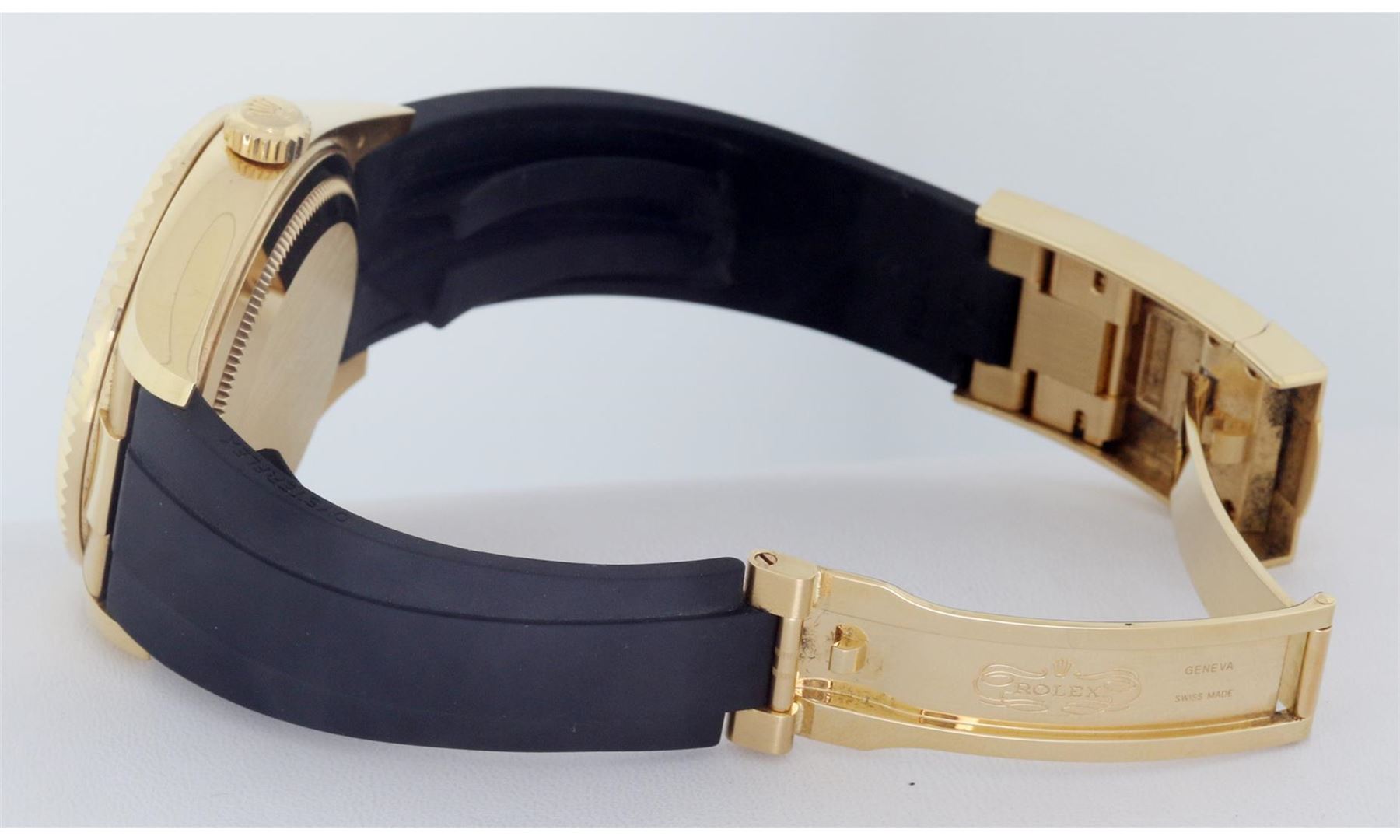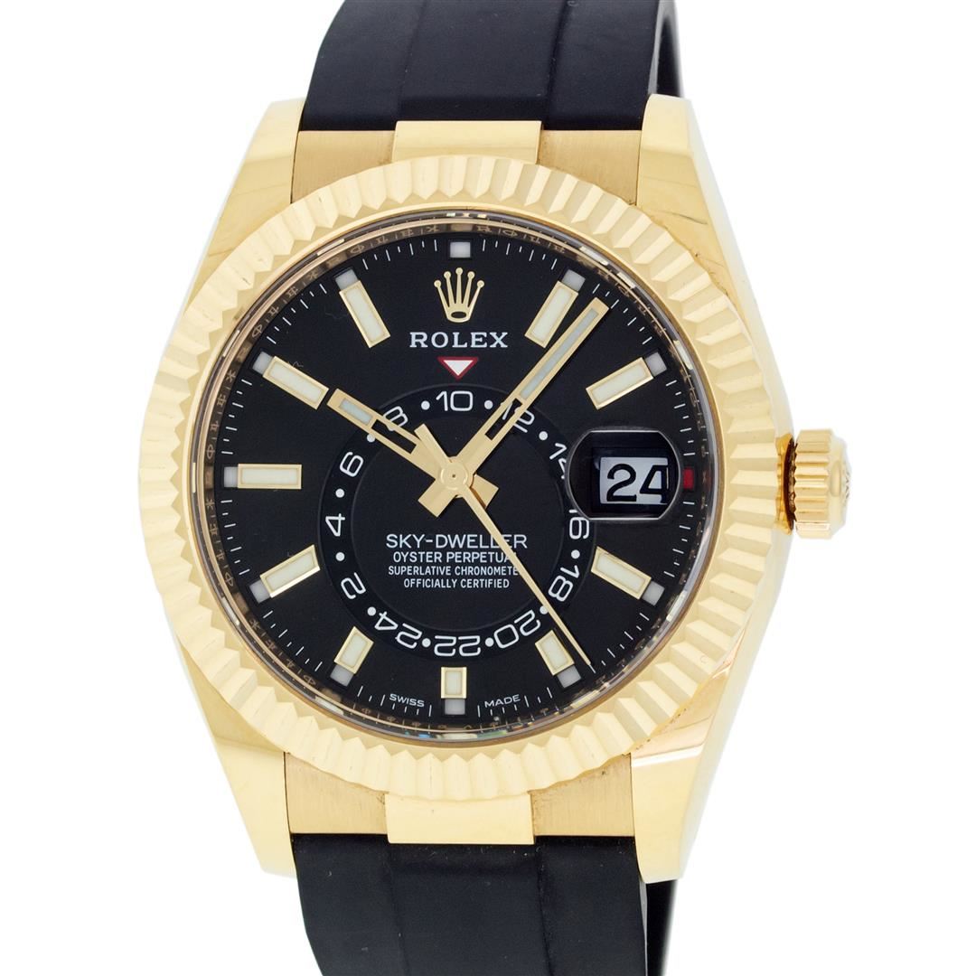 One Mens Pre Owned 18K Yellow Gold Rolex Sky Dweller With Date Polished, Serviced & Electronically Tested, Rolex 18K Yellow Gold Case: 42mm, Rolex Yellow Gold Crown, Rolex Bezel: 18K Yellow Gold Rotatable Fluted Bezel. Rolex Crystal: Sapphire With Magnified Date Window. Rolex Movement: Automatic Winding Movement Caliber 9001. Rolex Dial: Rolex Black Sky Dweller Dial with Luminous Index Hour Markers. Date Window: 3 O'Clock Position Date Display, Model: Sky Dweller, Quickset, Month Calendar Feature, Dual Time, 72 Hour Power Reserve, Condition: G-6 Extra Fine. Rolex Bracelet: Rubber Oyster Flex Band. 7.25 Inch Length, Standard Clasp, With Rolex Logo. This Watch Has Been Serviced Time Tested And Is In Excellent Condition It Is Free Of All Scratches And Dents. This Watch Comes With Rolex Box And Papers.