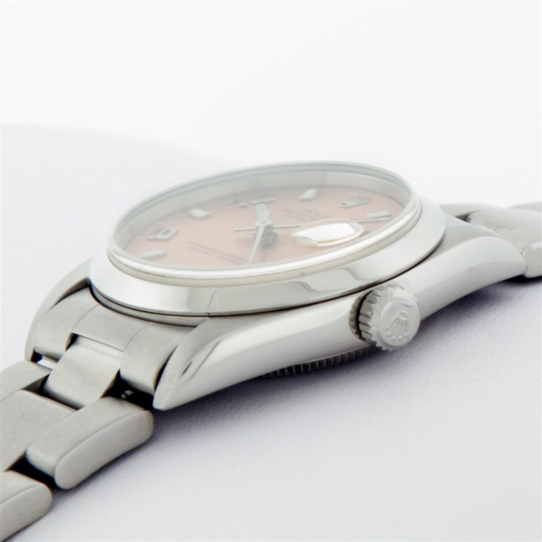 One Womens Pre Owned Midsize Stainless Steel Rolex Datejust Polished, Serviced & Electronically Tested, Rolex Stainless Steel Case Case: 31mm, Rolex Stainless Steel Crown, Rolex Bezel: 18K White Gold Fluted Bezel, Rolex Crystal: Sapphire With Cyclops Lens. Rolex Hands: Lumi Hands. Rolex Movement: Automatic Winding Movement. Rolex Dial: Factory Salmon Arabic Dial With Index Hour Markers. Date Window: 3 O'Clock Position Date Display, Quickset, Model: Midsize Datejust. Condition: G-6 Extra Fine. Rolex Bracelet: Stainless Steel Oyster Band. Bright Polish. 6.0 Inch Length, Adjustable. Standard Clasp, With Rolex Logo. This Watch Has Been Serviced Time Tested And Is In Excellent Condition It Is Free Of All Scratches And Dents.