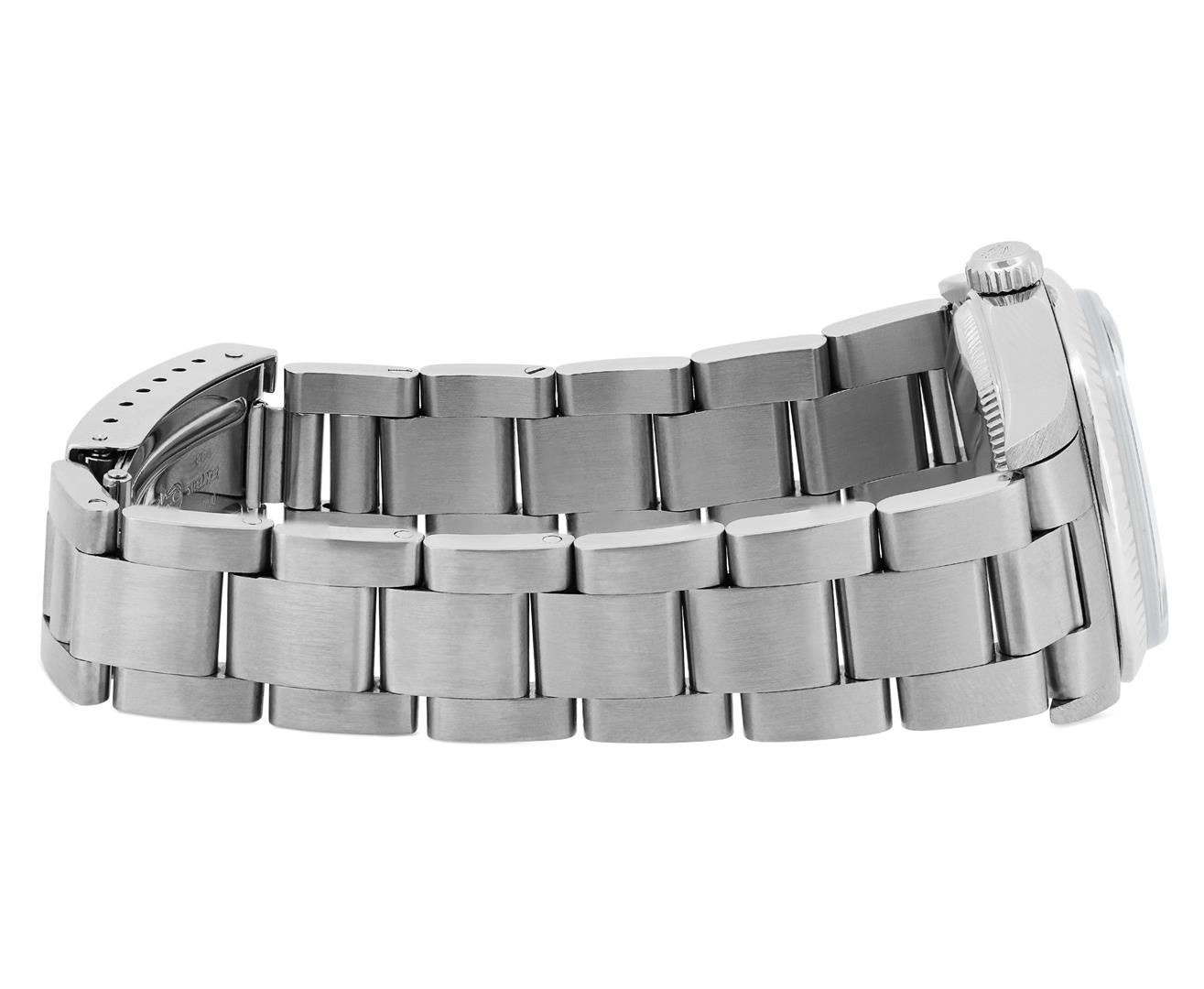 One Rolex Midsize Quickset Pre Owned Stainless Steel Datejust Wristwatch Polished with Satin Finish, Serviced & Electronically Tested, Stainless Steel Case: 31mm, Stainless Steel Crown, 18K White Gold Fluted Bezel. Custom Crystal: New Sapphire With Magnified Date Window. Hands: Luminescent Hands. Rolex Movement: Automatic Winding Movement 2235. Custom Dial: Custom Black Dial With Added Diamond Hour Markers. Date Window: 3 O'Clock Position Date Display, Model: 31MM Quickset Datejust. Condition: G-6 Extra Fine. Rolex Bracelet: Stainless Steel Oyster Band. Bright Polish & Satin Finish. 6.0 Inch Length, Adjustable. Standard Clasp, With Rolex Logo. This Watch Has Been Serviced Time Tested And Is In Excellent Condition It Is Free Of All Scratches And Dents. This Watch Comes With A Rolex Box.