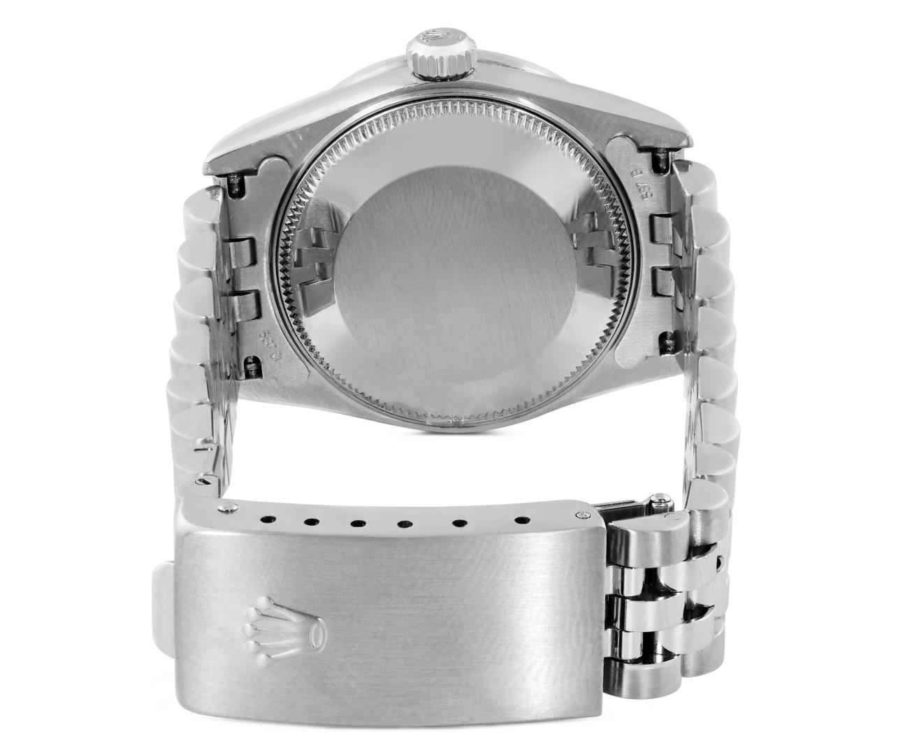 One Rolex Ladies Pre Owned Stainless Steel 31MM Datejust Wristwatch Polished Bright with Satin Finish, Serviced & Electronically Tested, Stainless Steel Case: 31mm, Stainless Steel Crown, Custom Bezel: New 18K White Gold Beadset Diamond Bezel, Diamond + Gem Count: 40 Diamonds. Custom Crystal: New Sapphire With Magnifying Date Window. Custom Hands: New Luminescent Hands. Rolex Movement: Automatic Winding Movement 2235. Rolex Dial: Factory Silver With Index Hour Markers, Lumi Dots, and Roman Track. Date Window: 3 O'Clock Position Date Display, Model: Quickset Sapphire Datejust. Condition: G-6 Extra Fine. Rolex Bracelet: Stainless Steel Jubilee Band. Bright Polish & Satin Finish. 6.0 Inch Length, Adjustable. Standard Clasp, With Rolex Logo. This Watch Has Been Serviced Time Tested And Is In Excellent Condition It Is Free Of All Scratches And Dents.