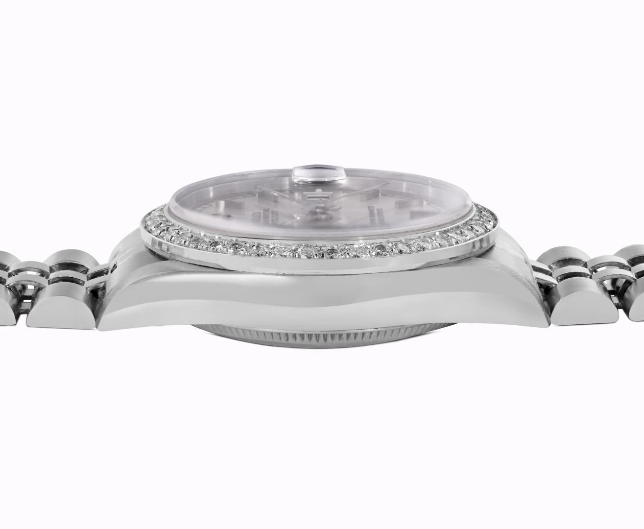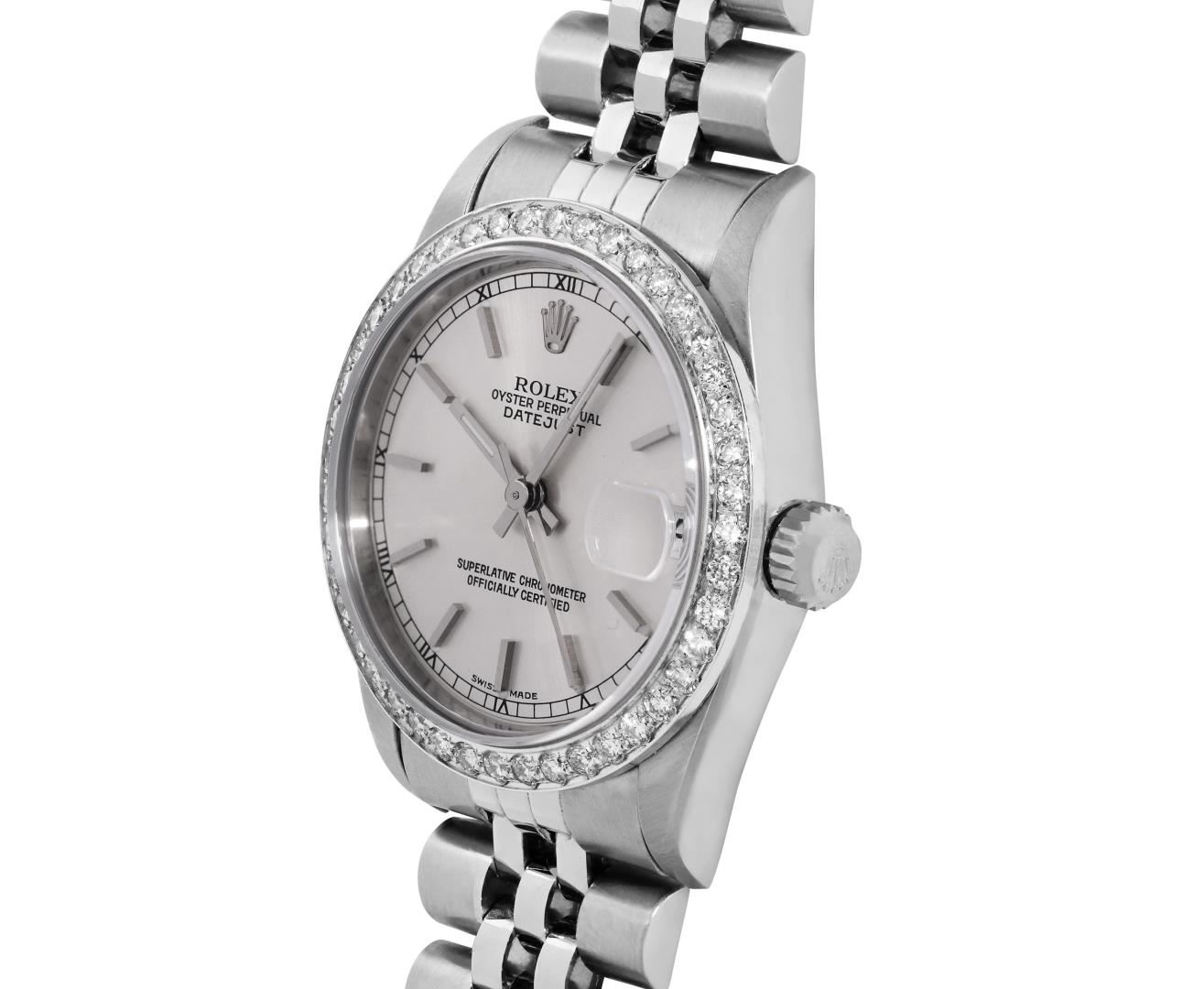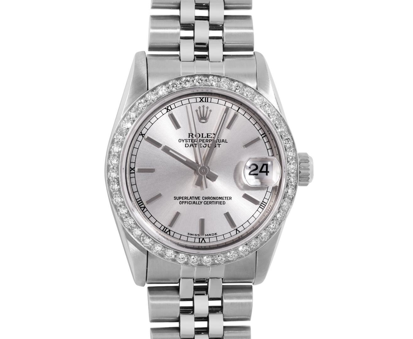 One Rolex Ladies Pre Owned Stainless Steel 31MM Datejust Wristwatch Polished Bright with Satin Finish, Serviced & Electronically Tested, Stainless Steel Case: 31mm, Stainless Steel Crown, Custom Bezel: New 18K White Gold Beadset Diamond Bezel, Diamond + Gem Count: 40 Diamonds. Custom Crystal: New Sapphire With Magnifying Date Window. Custom Hands: New Luminescent Hands. Rolex Movement: Automatic Winding Movement 2235. Rolex Dial: Factory Silver With Index Hour Markers, Lumi Dots, and Roman Track. Date Window: 3 O'Clock Position Date Display, Model: Quickset Sapphire Datejust. Condition: G-6 Extra Fine. Rolex Bracelet: Stainless Steel Jubilee Band. Bright Polish & Satin Finish. 6.0 Inch Length, Adjustable. Standard Clasp, With Rolex Logo. This Watch Has Been Serviced Time Tested And Is In Excellent Condition It Is Free Of All Scratches And Dents.