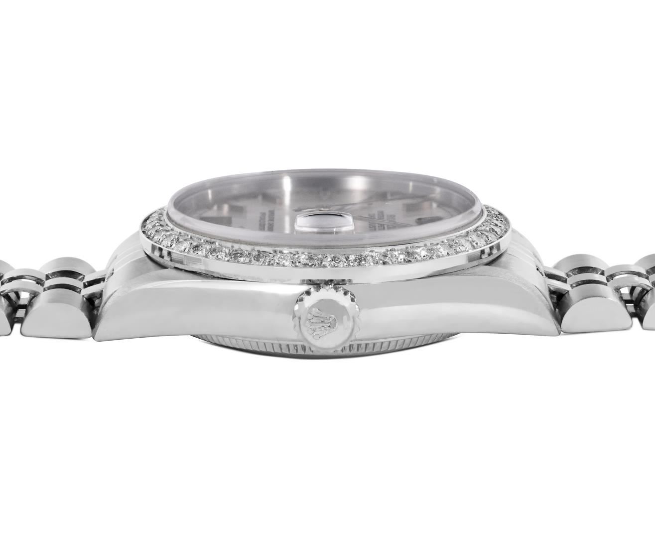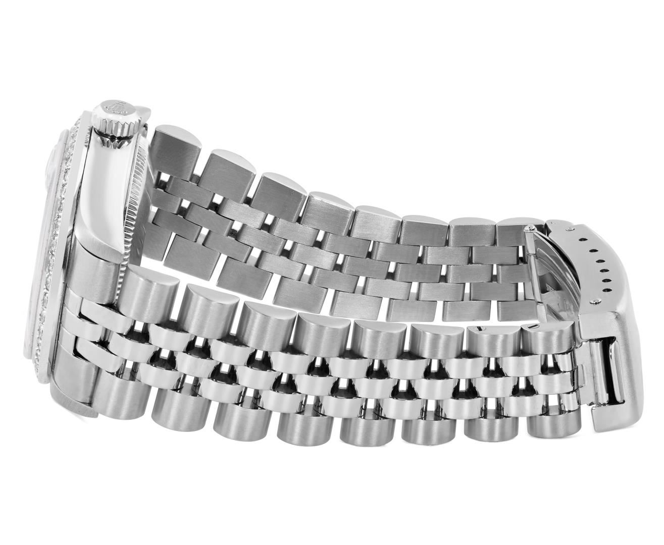 One Rolex Ladies Pre Owned Stainless Steel 31MM Datejust Wristwatch Polished Bright with Satin Finish, Serviced & Electronically Tested, Stainless Steel Case: 31mm, Stainless Steel Crown, Custom Bezel: New 18K White Gold Beadset Diamond Bezel, Diamond + Gem Count: 40 Diamonds. Custom Crystal: New Sapphire With Magnifying Date Window. Custom Hands: New Luminescent Hands. Rolex Movement: Automatic Winding Movement 2235. Rolex Dial: Factory Silver With Index Hour Markers, Lumi Dots, and Roman Track. Date Window: 3 O'Clock Position Date Display, Model: Quickset Sapphire Datejust. Condition: G-6 Extra Fine. Rolex Bracelet: Stainless Steel Jubilee Band. Bright Polish & Satin Finish. 6.0 Inch Length, Adjustable. Standard Clasp, With Rolex Logo. This Watch Has Been Serviced Time Tested And Is In Excellent Condition It Is Free Of All Scratches And Dents.