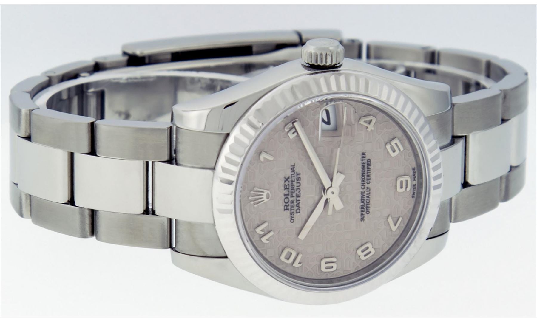 One Midsize Rolex Datejust Polished Bright with Satin Finish, Serviced & Electronically Tested, Stainless Steel Case:31mm, Stainless Steel Crown, Bezel: 18K White Gold Fluted Bezel, Crystal: Synthetic Sapphire Cyclops Lens. Movement: Automatic Winding Movement Caliber 2235. Custom Dial: White Arabic Jubilee Dial. Date Window: 3 O'Clock Position Date Display, Model: No Hole 178274 Datejust Quickset. Condition: G-6 Extra Fine. Bracelet: Stainless Steel Oyster Band. Bright Polish & Satin Finish. 6.0 Inch Length, Adjustable. Standard Clasp, With Rolex Logo.