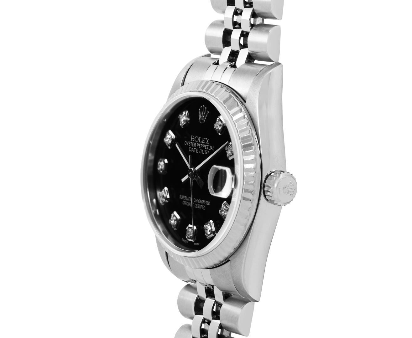 One Rolex Midsize Quickset Pre Owned Stainless Steel Datejust Wristwatch Polished with Satin Finish, Serviced And Electronically Tested, Stainless Steel Case: 31mm, Stainless Steel Crown, 18K White Gold Fluted Bezel. Custom Crystal: New Sapphire With Magnified Date Window. Custom Hands: New Solid Hands. Rolex Movement: Automatic Winding Movement 2235. Custom Dial: Custom Black Dial With Added Diamond Hour Markers, Diamond Count: 10 Diamonds On Dial. Date Window: 3 O'Clock Position Date Display, Model: 31MM Quickset Datejust. Condition: G-6 Extra Fine. Rolex Bracelet: Stainless Steel Jubilee Band. Bright Polish And Satin Finish. 6.0 Inch Length, Adjustable. Standard Clasp, With Rolex Logo. This Watch Has Been Serviced Time Tested And Is In Excellent Condition It Is Free Of All Scratches And Dents. This Watch Comes With A Rolex Box.