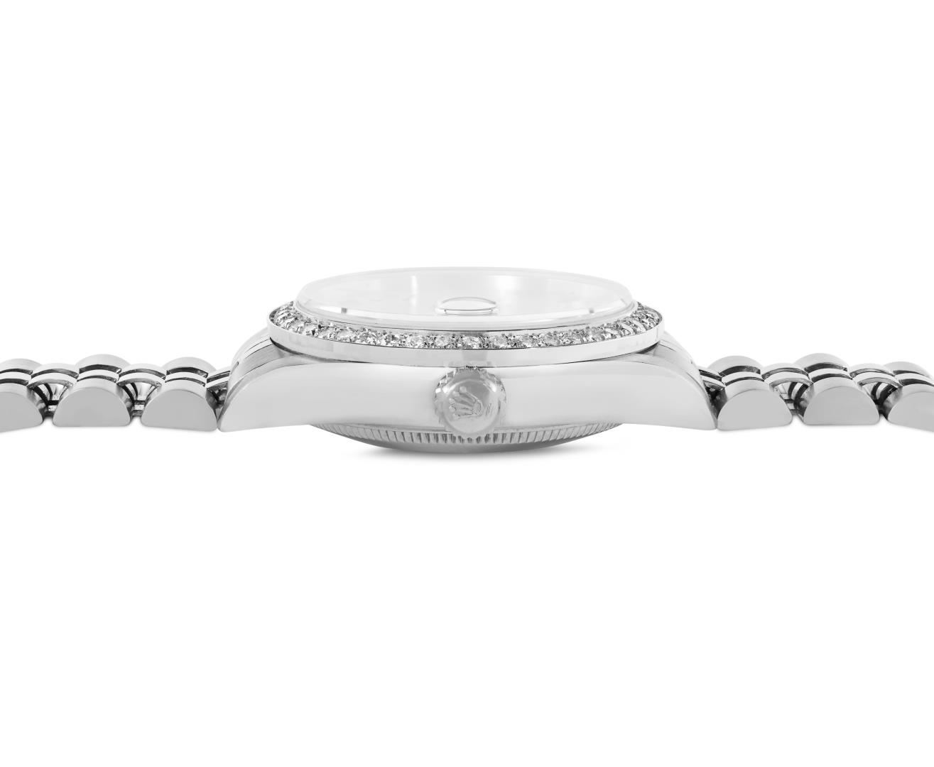One Rolex Ladies Midsize Pre Owned Stainless Steel 31MM Datejust Wristwatch Polished Bright with Satin Finish, Serviced And Electronically Tested, Stainless Steel Case: 31mm, Stainless Steel Crown, Custom Bezel: New 18K White Gold Beadset Diamond Bezel, Diamond + Gem Count: 40 Diamonds. Custom Crystal: New Sapphire With Magnifying Date Window. Custom Hands: New Hands. Rolex Movement: Automatic Winding Movement 2235. Rolex Dial: Factory Cream Dial With Arabic Hour Markers. Date Window: 3 O'Clock Position Date Display, Model: Quickset Sapphire Datejust. Condition: G-6 Extra Fine. Rolex Bracelet: Stainless Steel Jubilee Band. Bright Polish And Satin Finish. 6.0 Inch Length, Adjustable. Standard Clasp, With Rolex Logo. This Watch Has Been Serviced Time Tested And Is In Excellent Condition It Is Free Of All Scratches And Dents.