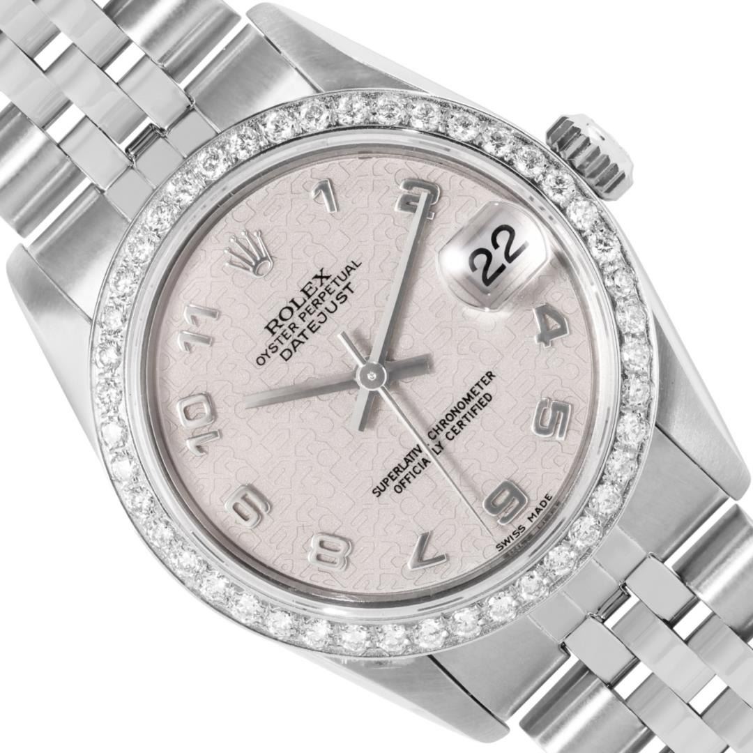 One Rolex Ladies Midsize Pre Owned Stainless Steel 31MM Datejust Wristwatch Polished Bright with Satin Finish, Serviced And Electronically Tested, Stainless Steel Case: 31mm, Stainless Steel Crown, Custom Bezel: New 18K White Gold Beadset Diamond Bezel, Diamond + Gem Count: 40 Diamonds. Custom Crystal: New Sapphire With Magnifying Date Window. Custom Hands: New Hands. Rolex Movement: Automatic Winding Movement 2235. Rolex Dial: Factory Cream Dial With Arabic Hour Markers. Date Window: 3 O'Clock Position Date Display, Model: Quickset Sapphire Datejust. Condition: G-6 Extra Fine. Rolex Bracelet: Stainless Steel Jubilee Band. Bright Polish And Satin Finish. 6.0 Inch Length, Adjustable. Standard Clasp, With Rolex Logo. This Watch Has Been Serviced Time Tested And Is In Excellent Condition It Is Free Of All Scratches And Dents.