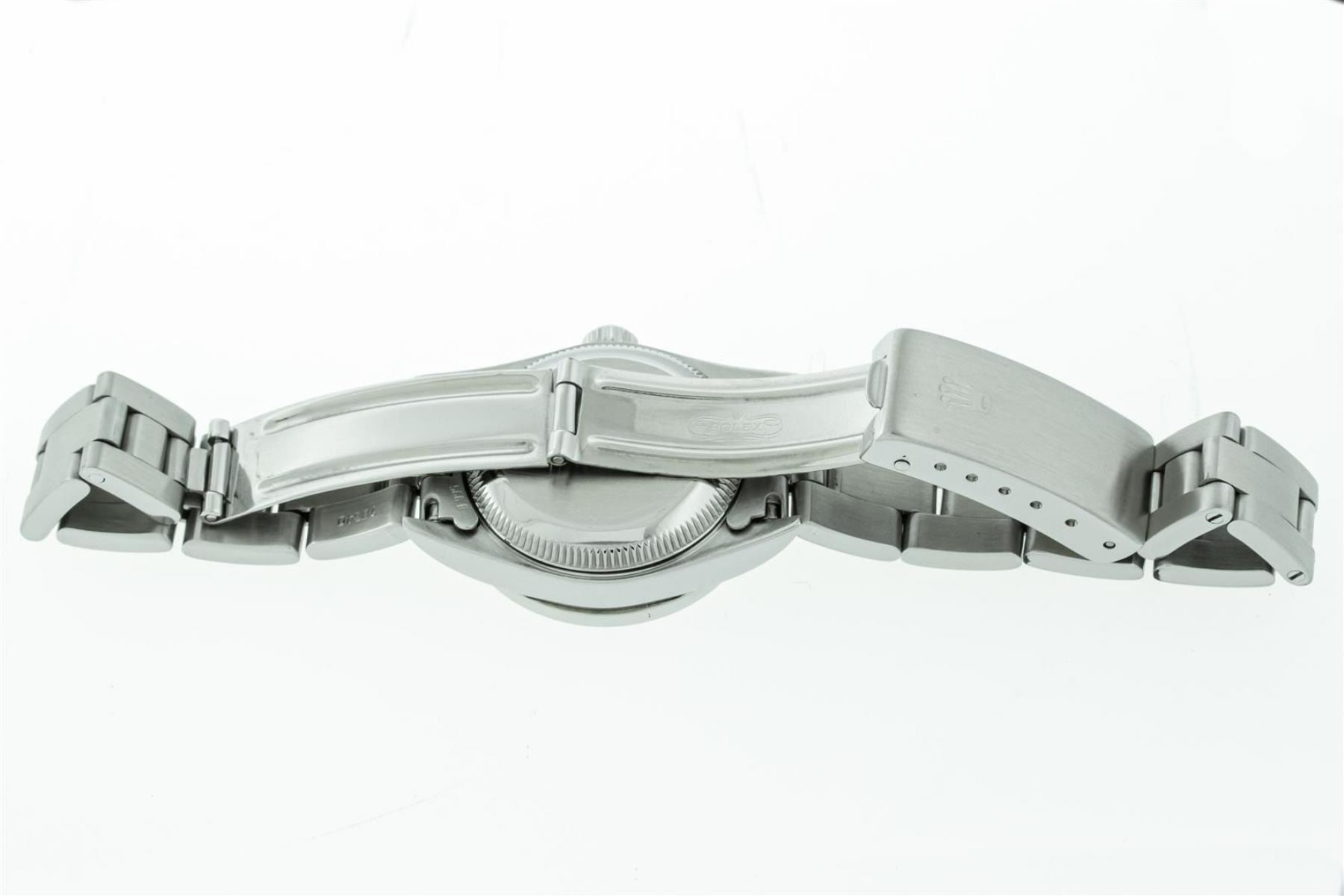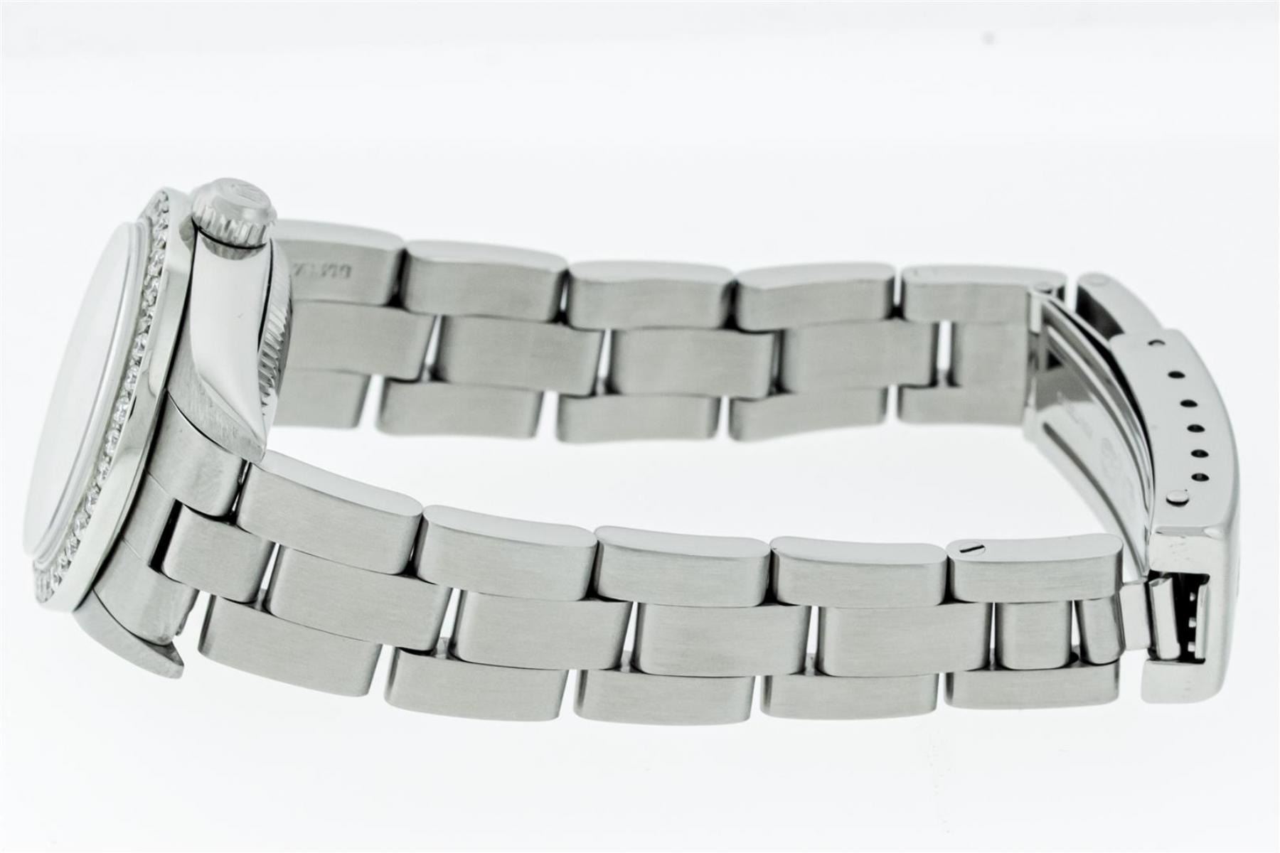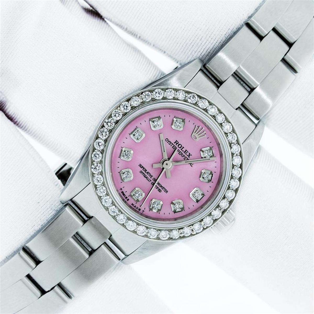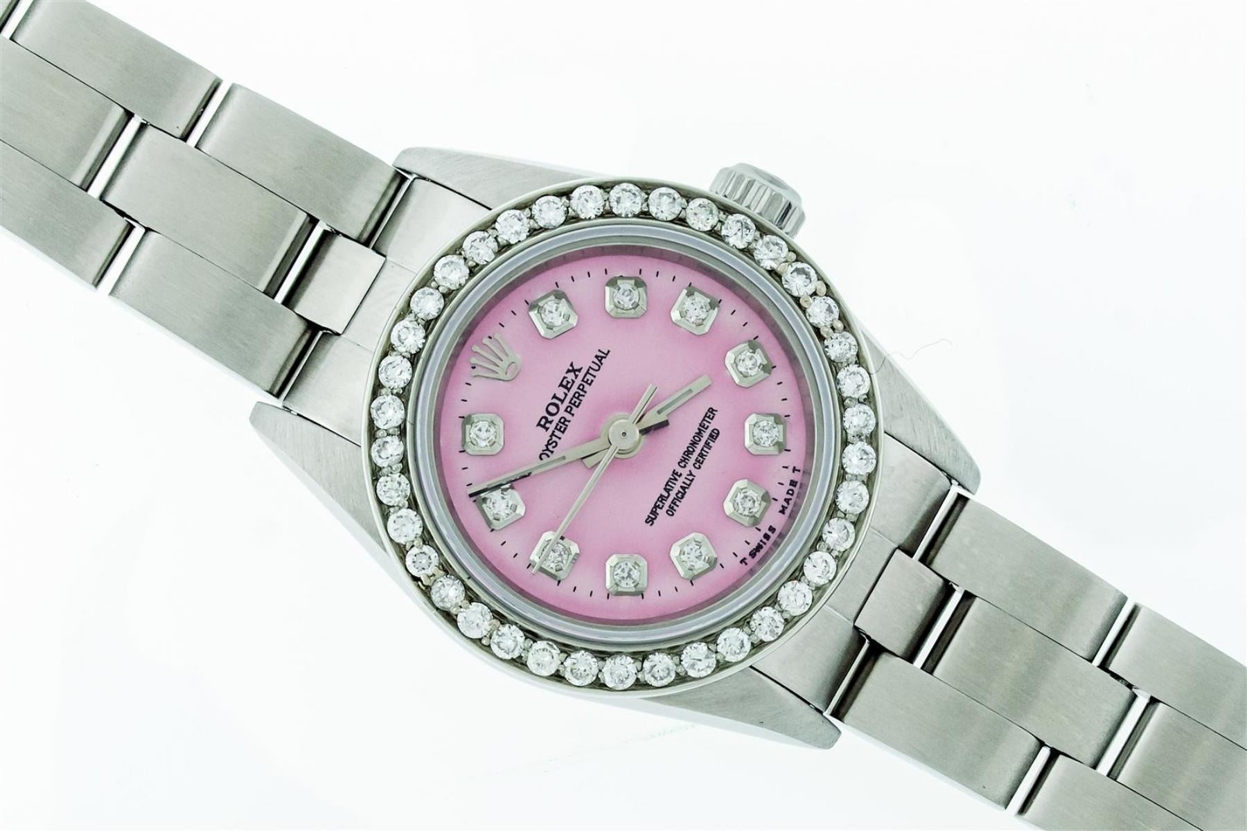 One Ladies Stainless Steel Rolex Oyster Perpetual Datejust Polished Bright with Satin Finish, Serviced & Electronically Tested, Stainless Steel Case: 25mm, Stainless Steel Crown, Custom Bezel: Stainless Steel Beadset Diamond Bezel, Diamond Count: 38 Diamonds In Bezel, Diamond Color: G To H, Clarity VS2-SI1, Custom Crystal: New Acrylic Plastic Crystal. Custom Hands: New Luminescent Hands. Movement: Automatic Winding Movement 2230. Custom Dial: Pink Diamond Dial, Diamond Count: 10 Diamonds On Dial. Date Window: 3 O'Clock Position Date Display, Model: Oyster Perpetual 76080. Condition: G-6 Extra Fine. Bracelet: Stainless Steel Oyster Band. Bright Polish & Satin Finish. 6.0 Inches Length, Adjustable. Original Clasp With Rolex Logo. This Watch Has Been Serviced Time Tested And Is In Excellent Condition It Is Free Of All Scratches And Dents. This Watch Comes With A Rolex Box, Rolex Booklets, And Rolex Red Wallet.