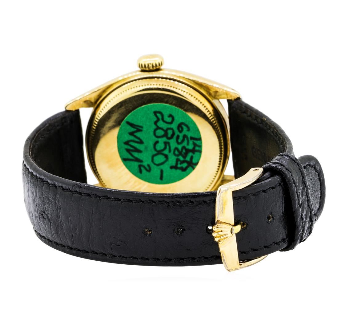 One man's, hand crafted and machine milled Rolex round case Oyster Perpetual wrist watch electronically tested 14KT yellow gold, Crown: gold screw-down, Bezel: gold, Crystal: acrylic, Movement: 25 jewel automatic, Dial: cream baton, pointed type hands and stick marker numerals, Bracelet: leather, Condition: G-5 fine.. Total Weight of Watch 47.00gm GAS Appraised at $4800.00. GAS Appraised at $4,800.00.