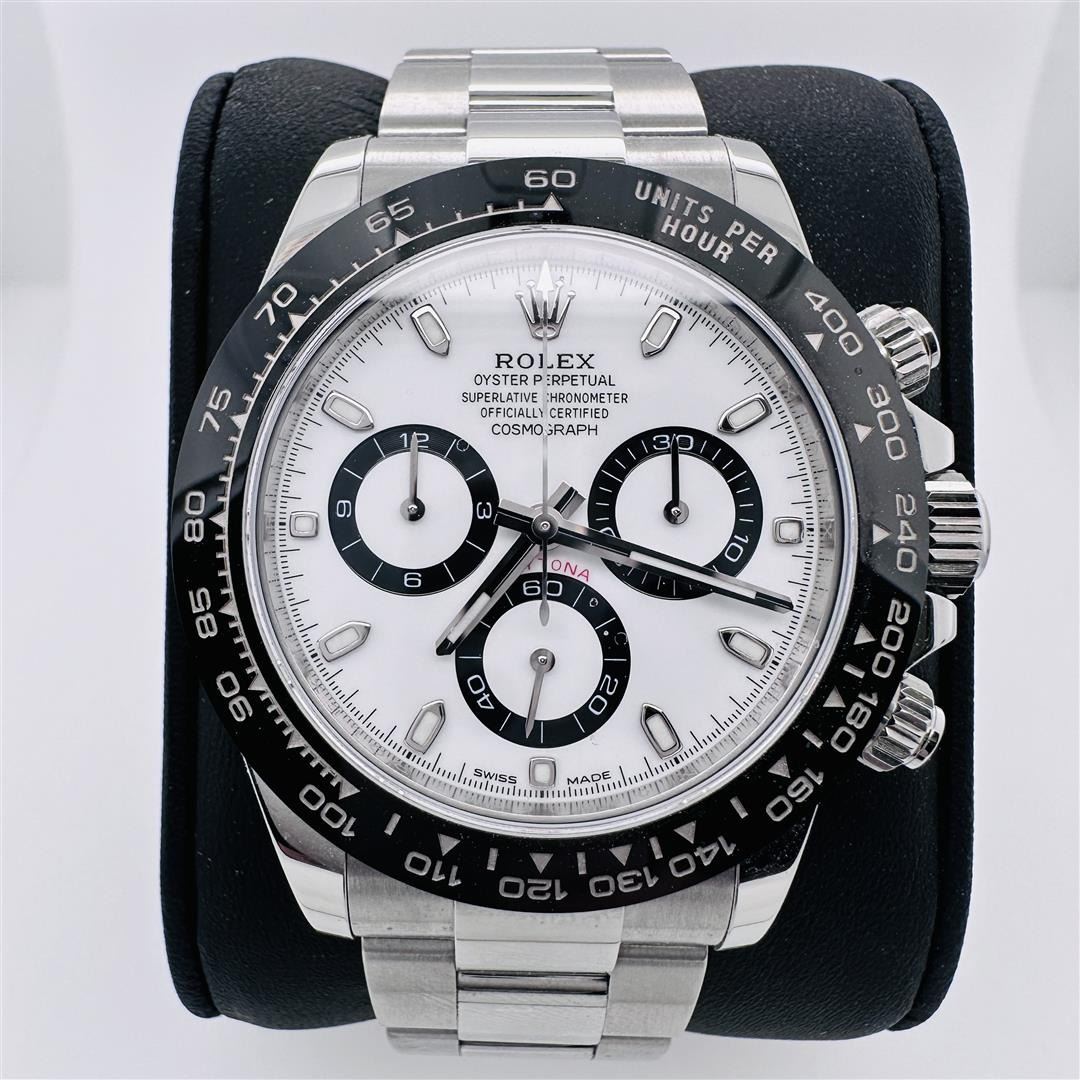 Rolex Panda 2022 Daytona Cosmograph 40mm Panda Men Oyster White Dial Chrono Watch. You are Bidding on a BRAND NEW ROLEX DAYTONA COSMOGRAPH STEEL OYSTER BLACK CERAMIC BEZEL WHITE DIAL. 100% guaranteed authentic! Includes Everything: The Original Rolex Boxes, Booklets & Rolex Card (Papers). Automatic Movement, Full Chronograph, Hours, Minutes, Seconds, Case Diameter: 40mm, Stainless Steel Case, Rolex New Style Stainless Steel Oyster Band with Deployment Buckle. Rolex New Style Black Ceramic Bezel Scratch Resistant Sapphire Crystal. This watch is in excellent condition. The watch photographed is the actual watch.