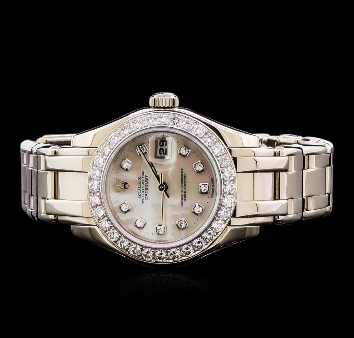 One ladies, hand crafted & machine milled Rolex Masterpiece DateJust, model wristwatch electronically tested 18KT White gold, Swiss & Rolex Hallmarked Case: 29mm oyster, Water resistant: 100 meters / 330 feet. Scalloped Rolex logo'd Crown: twinlock, double water proof system, Custom Bezel: diamond set, Rolex Hallmarked Crystal: synthetic sapphire cyclops lens. Circa 2001. Movement: superlative chronometer automatic. Rolex signed Dial: light mother of pearl, with baton hands and raised diamond markers, Date Window: 3 o'clock position, quick set, Date Wheel: White color, Rolex Bracelet: 18KT White gold Pearlmaster links, Condition: G-6 Extra Fine. Bright polish finish. Six and three quarter inch length. Swiss Hallmarked Rolex concealed deployment clasp, with logo. Containing: Thirty Two round brilliant cut diamonds, estimated total weight equals 1.44ct. Set & graded in the custom bezel. Clarity VVS-2 to VS-2. Color: F - H. Total Weight of Diamonds 1.44ct. Total Weight of Watch 106.72gm. AIG Appraised at $36,000.00.