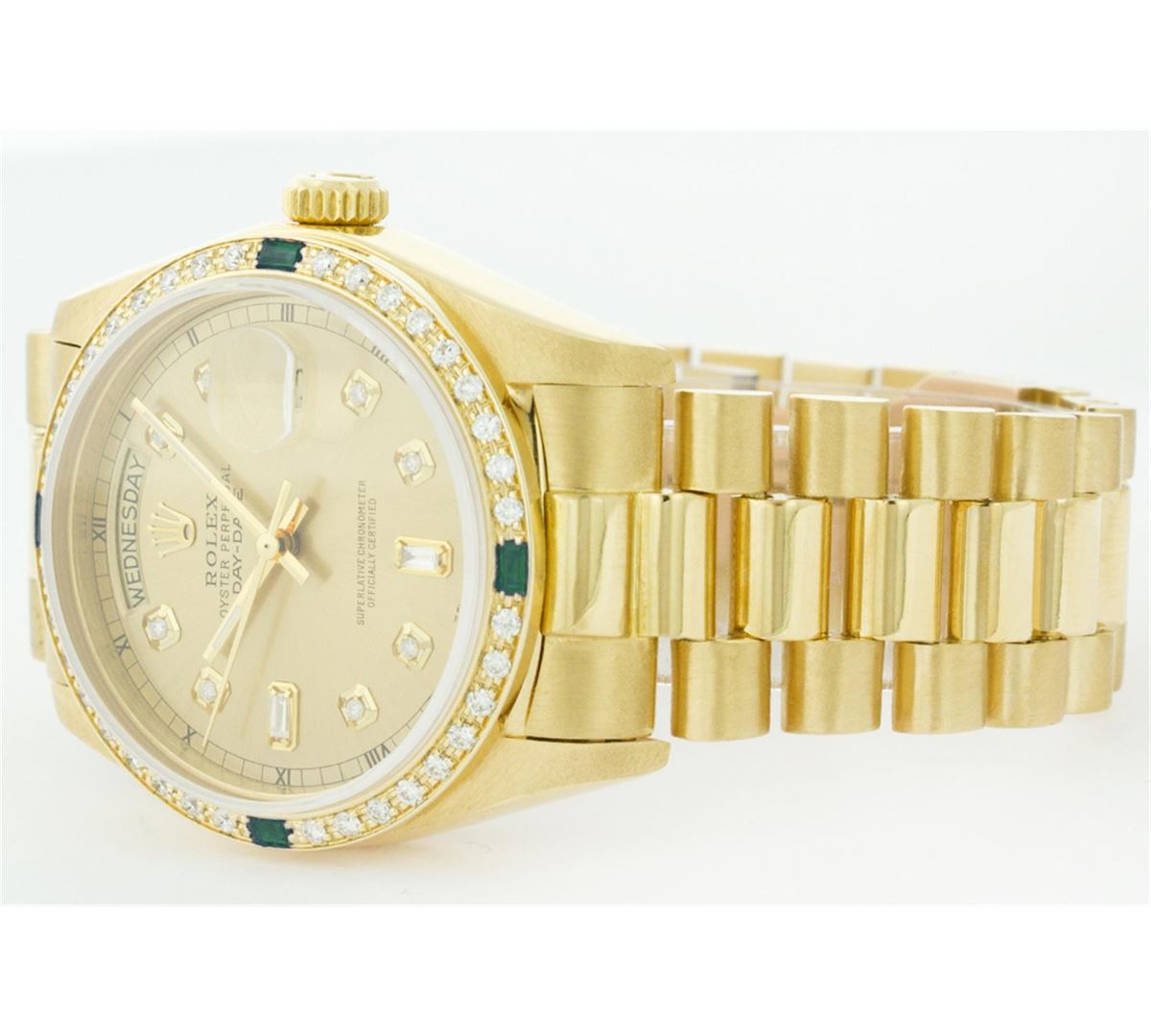 One Gents Rolex President Polished, Serviced & Electronically Tested, Yellow Gold Case:36mm, Yellow Gold Crown, Custom Bezel: 18K Yellow Gold Emerald Beadset Diamond Bezel, Diamond + Gem Count: 36 Diamonds + 4 Emeralds, Total Weight 1.00 Carat, Clarity: SI-VS, Color: G to H. Custom Crystal: Synthetic Sapphire Cyclops Lens. Movement: Automatic Winding Movement Caliber 3055. Custom Dial: Champagne Diamond Dial With Square Roman Track, Diamond Count: (8 Diamonds In Dial + 2 Baguette Diamonds In Dial) G To H In Color, Clarity: SI-VS. Date Window: 3 O'Clock Position Date Display, Day Window: 12 O'Clock Position Date Display. Quickset, Model: 18038 Condition: G-6 Extra Fine. Bracelet: Yellow Gold President. Bright Polish. 6.5 Inch Length, Standard Hidden Clasp President Clasp, With Rolex Logo.