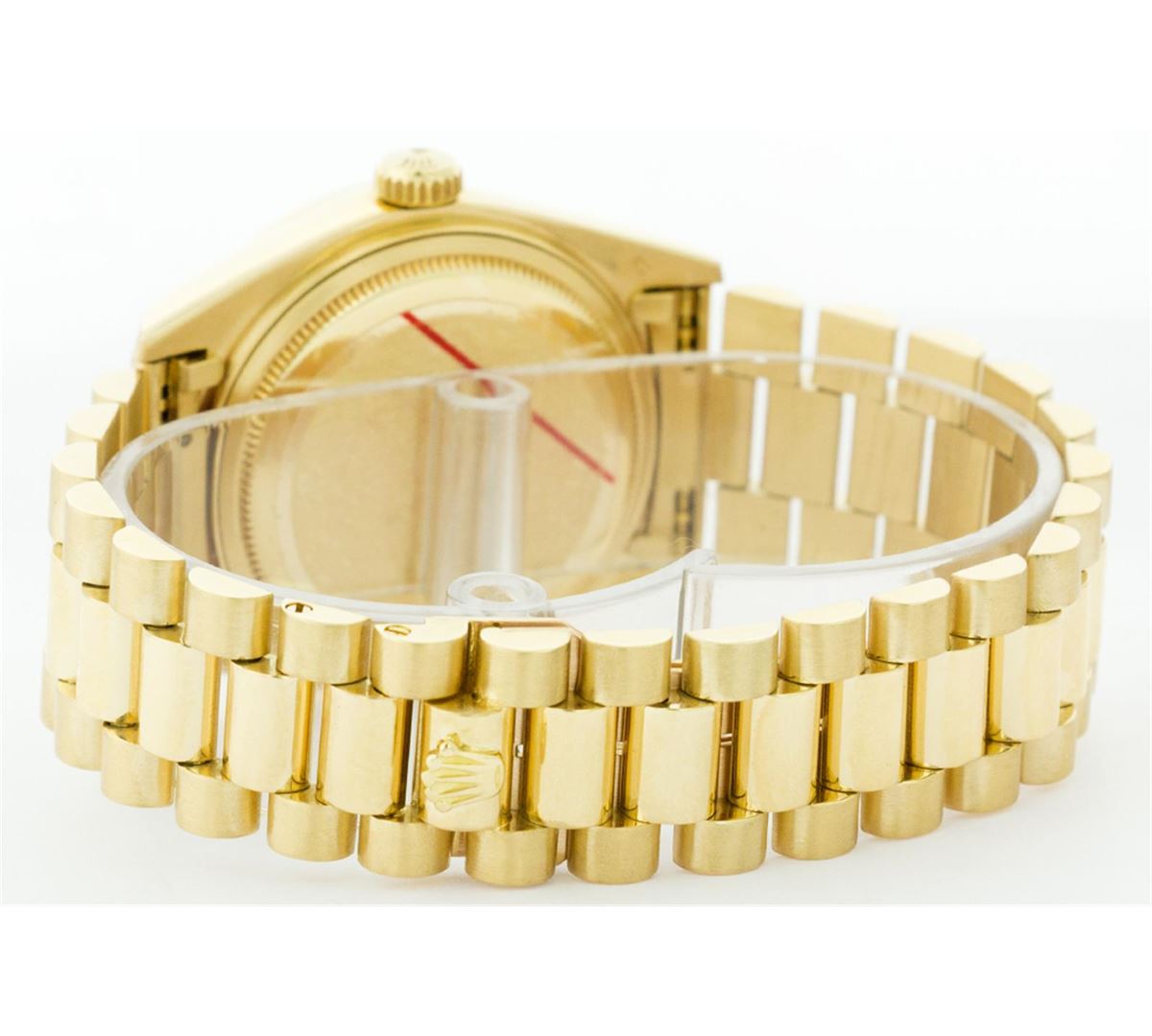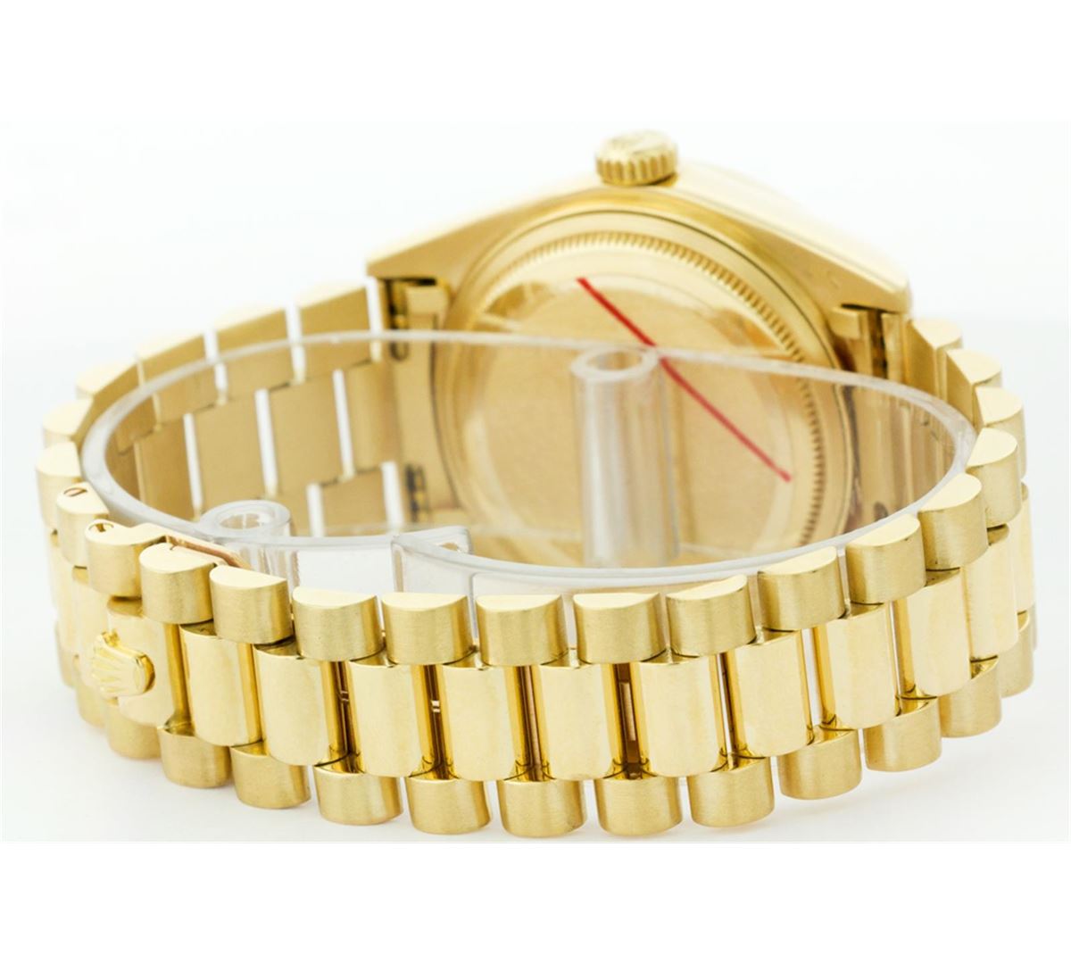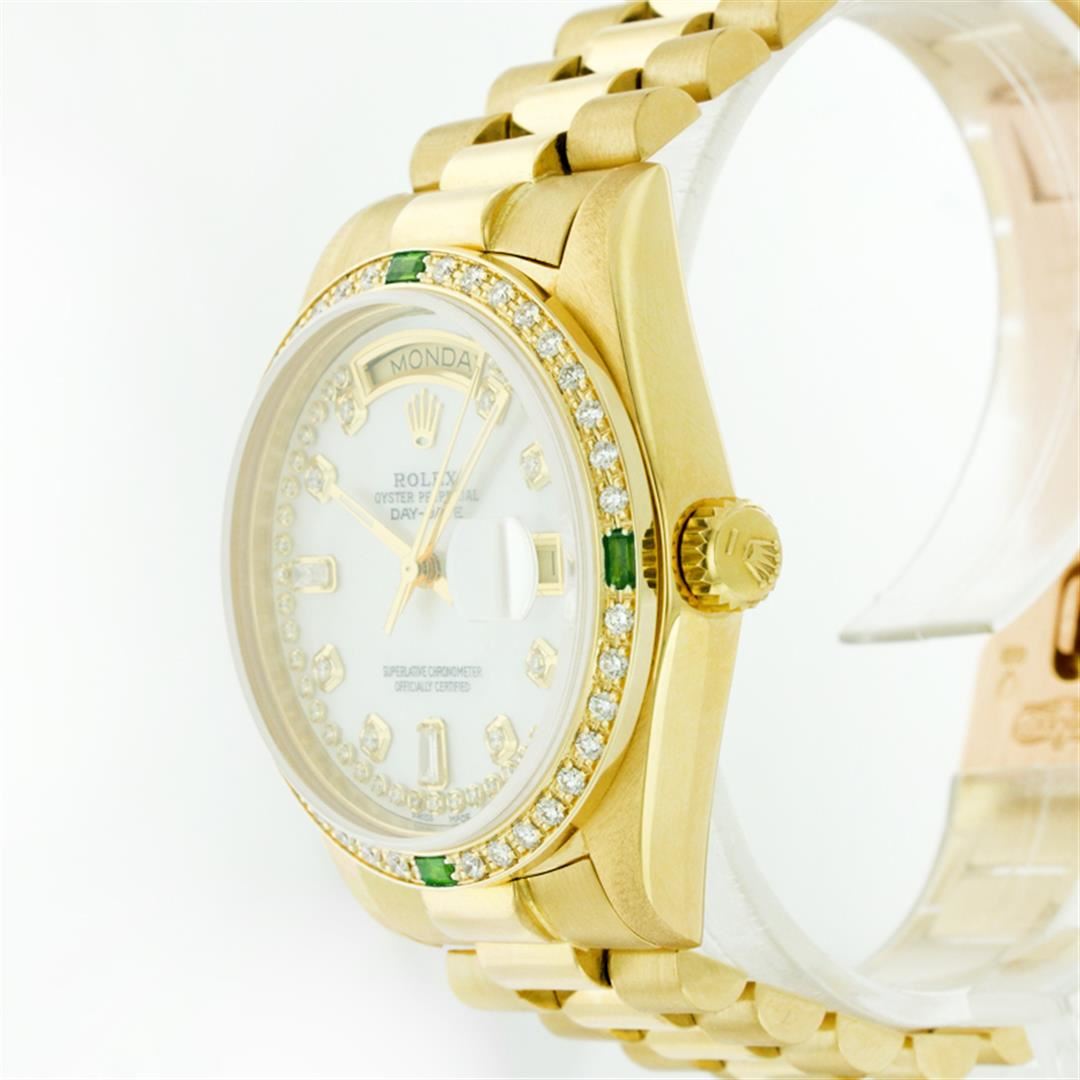 One Gents Rolex President Polished, Serviced & Electronically Tested, Yellow Gold Case:36mm, Yellow Gold Crown, Custom Bezel: 18K Yellow Gold Emerald Beadset Diamond Bezel, Diamond + Gem Count: 36 Diamonds + 4 Emeralds Total Weight 1.00 Carat, Clarity: SI-VS, Color: G to H. Custom Crystal: Synthetic Sapphire Cyclops Lens. Movement: Automatic Winding Movement Caliber 3055. Custom Dial: Mother Of Pearl String Diamond Dial With 2 Baguettes, (49 Diamond In Dial + 2 Baguette Diamonds In Dial) G To H In Color, Clarity: SI-VS. Date Window: 3 O'Clock Position Date Display, Day Window: 12 O'Clock Position Date Display. Quickset, Model: 18038 Condition: G-6 Extra Fine. Bracelet: Yellow Gold President. Bright Polish. 6.5 Inch Length, Standard Hidden President Clasp President Band, With Rolex Logo.