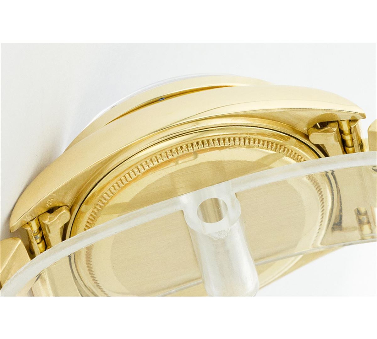 One Gents Rolex President Polished, Serviced & Electronically Tested, Yellow Gold Case:36mm, Yellow Gold Crown, Custom Diamond Lugs: 24 Diamonds In Lugs, Clarity SI-VS, Color: G to H Custom Bezel: 18K Yellow Gold Sapphire Beadset Diamond Bezel, Diamond + Gem Count: 36 Diamonds + 4 Sapphires Total Weight 1.00 Carat, Clarity: SI-VS, Color: G to H. Custom Crystal: Synthetic Sapphire Cyclops Lens. Movement: Automatic Winding Movement Caliber 3055. Custom Dial: Blue Vignette With Diamond Hour Markers, (8 Diamond In Dial + 2 Baguette Diamonds In Dial) G To H In Color, Clarity: SI-VS. Date Window: 3 O'Clock Position Date Display, Quickset, Model: 18038 Condition: G-6 Extra Fine. Bracelet: Yellow Gold President. Bright Polish. 6.5 Inch Length, Standard President Clasp, With Rolex Logo. Comes with a six month warranty card.