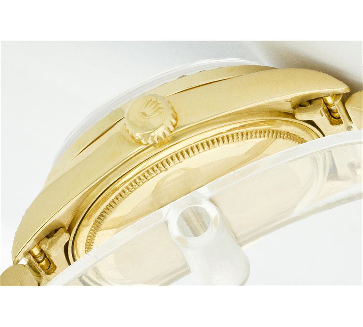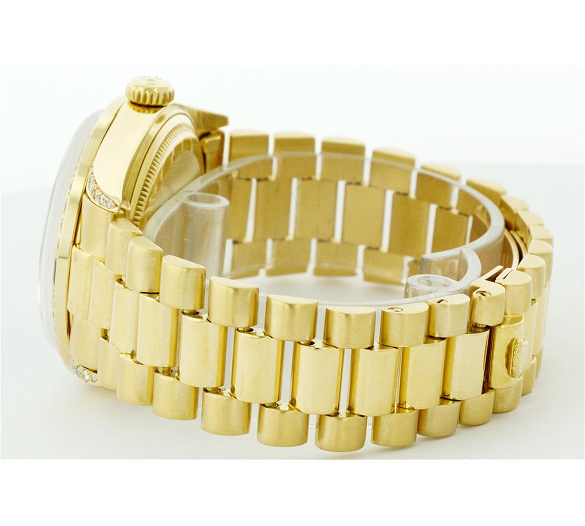 One Gents Rolex President Polished, Serviced & Electronically Tested, Yellow Gold Case:36mm, Yellow Gold Crown, Custom Diamond Lugs: 24 Diamonds In Lugs, Clarity SI-VS, Color: G to H Custom Bezel: 18K Yellow Gold Sapphire Beadset Diamond Bezel, Diamond + Gem Count: 36 Diamonds + 4 Sapphires Total Weight 1.00 Carat, Clarity: SI-VS, Color: G to H. Custom Crystal: Synthetic Sapphire Cyclops Lens. Movement: Automatic Winding Movement Caliber 3055. Custom Dial: Blue Vignette With Diamond Hour Markers, (8 Diamond In Dial + 2 Baguette Diamonds In Dial) G To H In Color, Clarity: SI-VS. Date Window: 3 O'Clock Position Date Display, Quickset, Model: 18038 Condition: G-6 Extra Fine. Bracelet: Yellow Gold President. Bright Polish. 6.5 Inch Length, Standard President Clasp, With Rolex Logo.