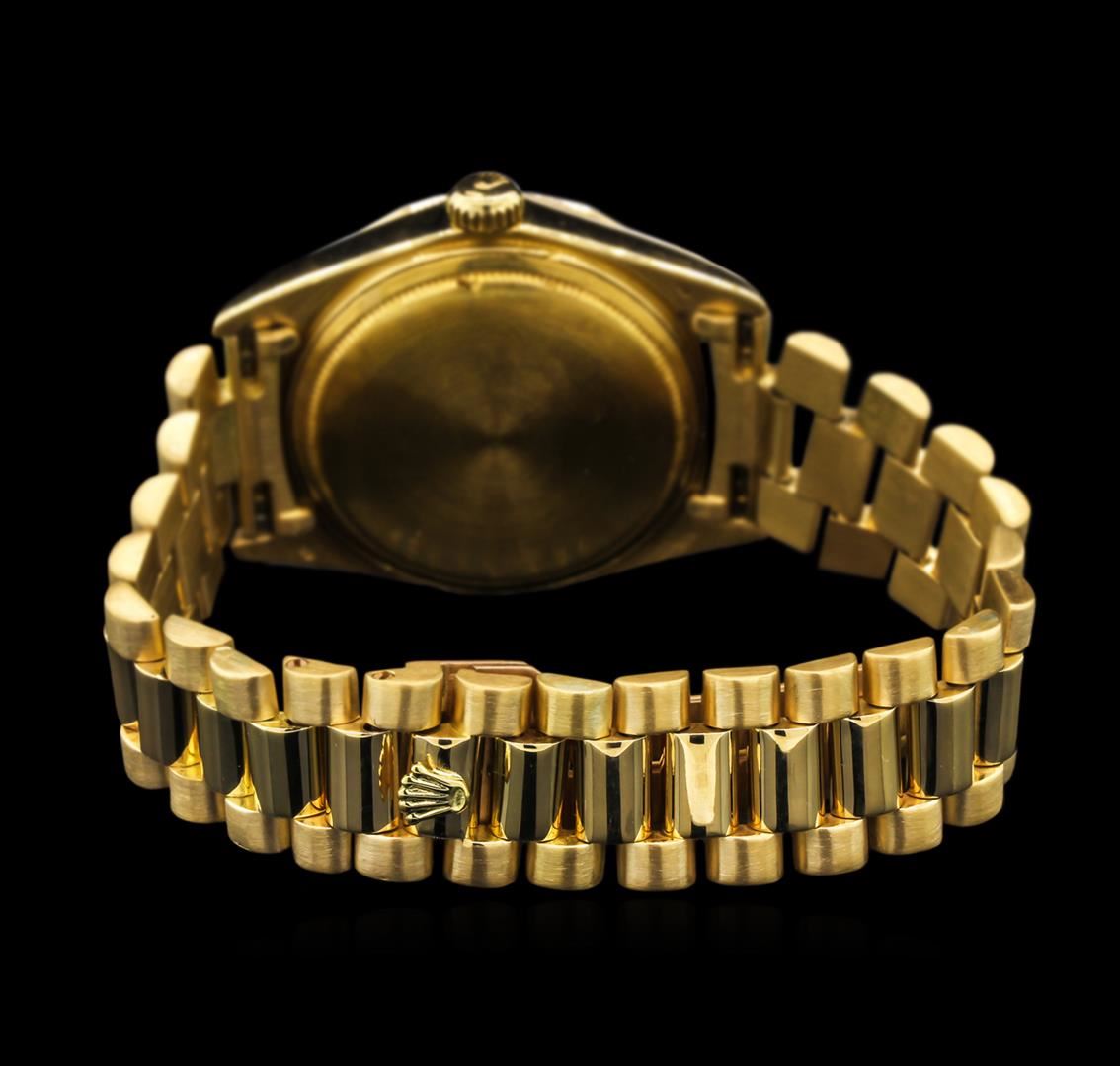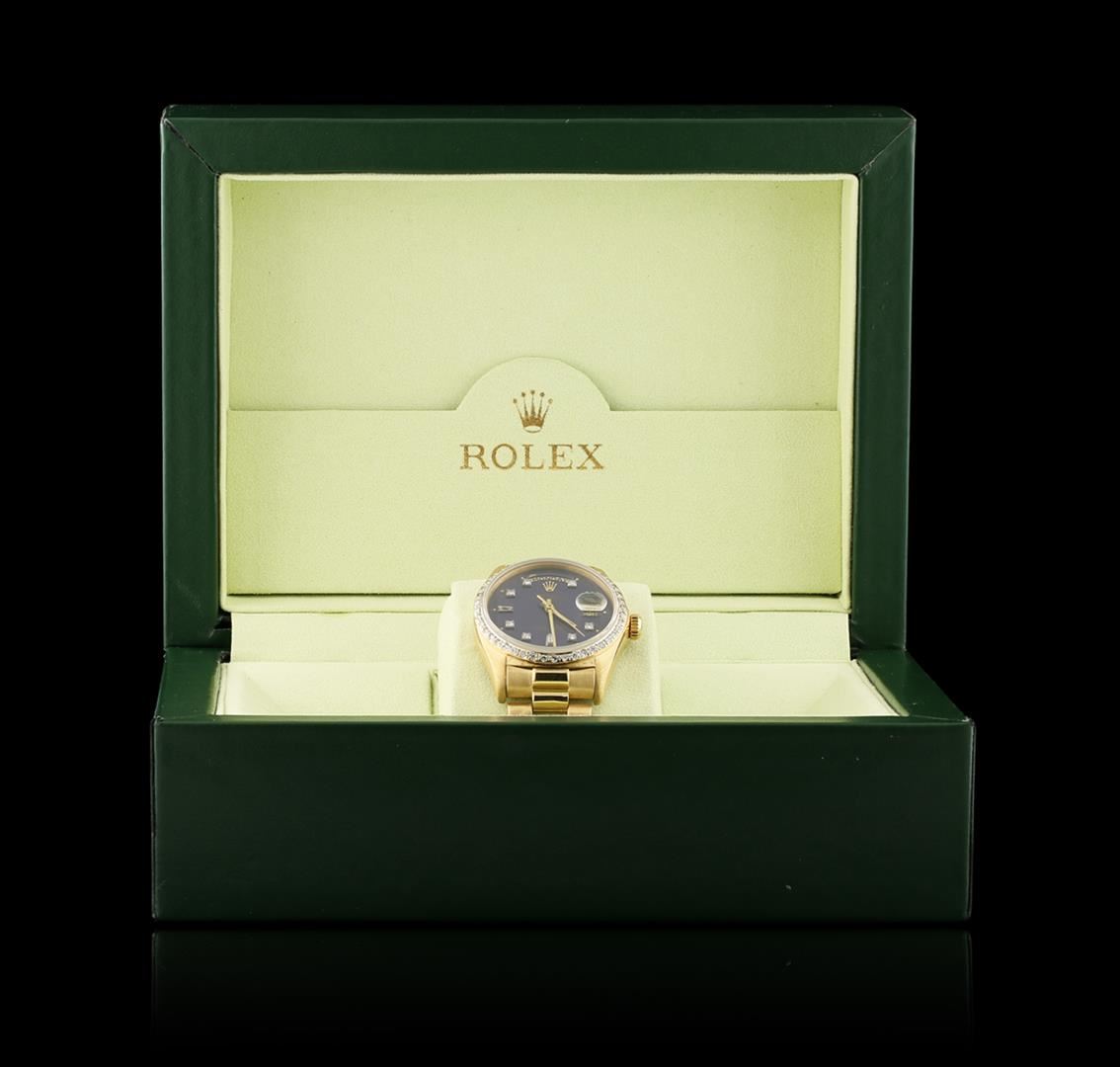 One gents, hand crafted & machine milled Rolex DayDate Model the President wristwatch electronically tested 18KT yellow gold, Case: 35mm oyster, Crown: twin lock with logo, Custom Bezel: diamond set, Custom Crystal: synthetic sapphire cyclops lens. Circa: 1978.Movement: superlative chronometer, Custom Dial: Violet-Blue color, with baton hands, & diamond markers, Calendar: single-quick set, Bracelet: 18KT yellow gold, bright polish & brushed finish, Condition: G-4 Average. Seven and one quarter inch length. Swiss Hallmarked concealed deployment clasp, with logo Containing: Forty Four prong set round brilliant cut diamonds, approximate total weight equals 1.00ct. Set & graded in the bezel. Clarity: SI-2 to I-2. Color: G - I. Total Weight of Diamonds 1.00ct. Total Weight of Watch 119.14gm. AIG Appraised at $22,050.00.