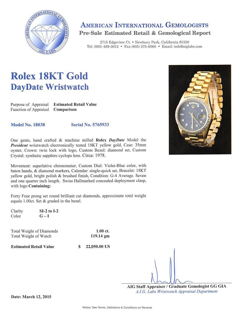 One gents, hand crafted & machine milled Rolex DayDate Model the President wristwatch electronically tested 18KT yellow gold, Case: 35mm oyster, Crown: twin lock with logo, Custom Bezel: diamond set, Custom Crystal: synthetic sapphire cyclops lens. Circa: 1978.Movement: superlative chronometer, Custom Dial: Violet-Blue color, with baton hands, & diamond markers, Calendar: single-quick set, Bracelet: 18KT yellow gold, bright polish & brushed finish, Condition: G-4 Average. Seven and one quarter inch length. Swiss Hallmarked concealed deployment clasp, with logo Containing: Forty Four prong set round brilliant cut diamonds, approximate total weight equals 1.00ct. Set & graded in the bezel. Clarity: SI-2 to I-2. Color: G - I. Total Weight of Diamonds 1.00ct. Total Weight of Watch 119.14gm. AIG Appraised at $22,050.00.