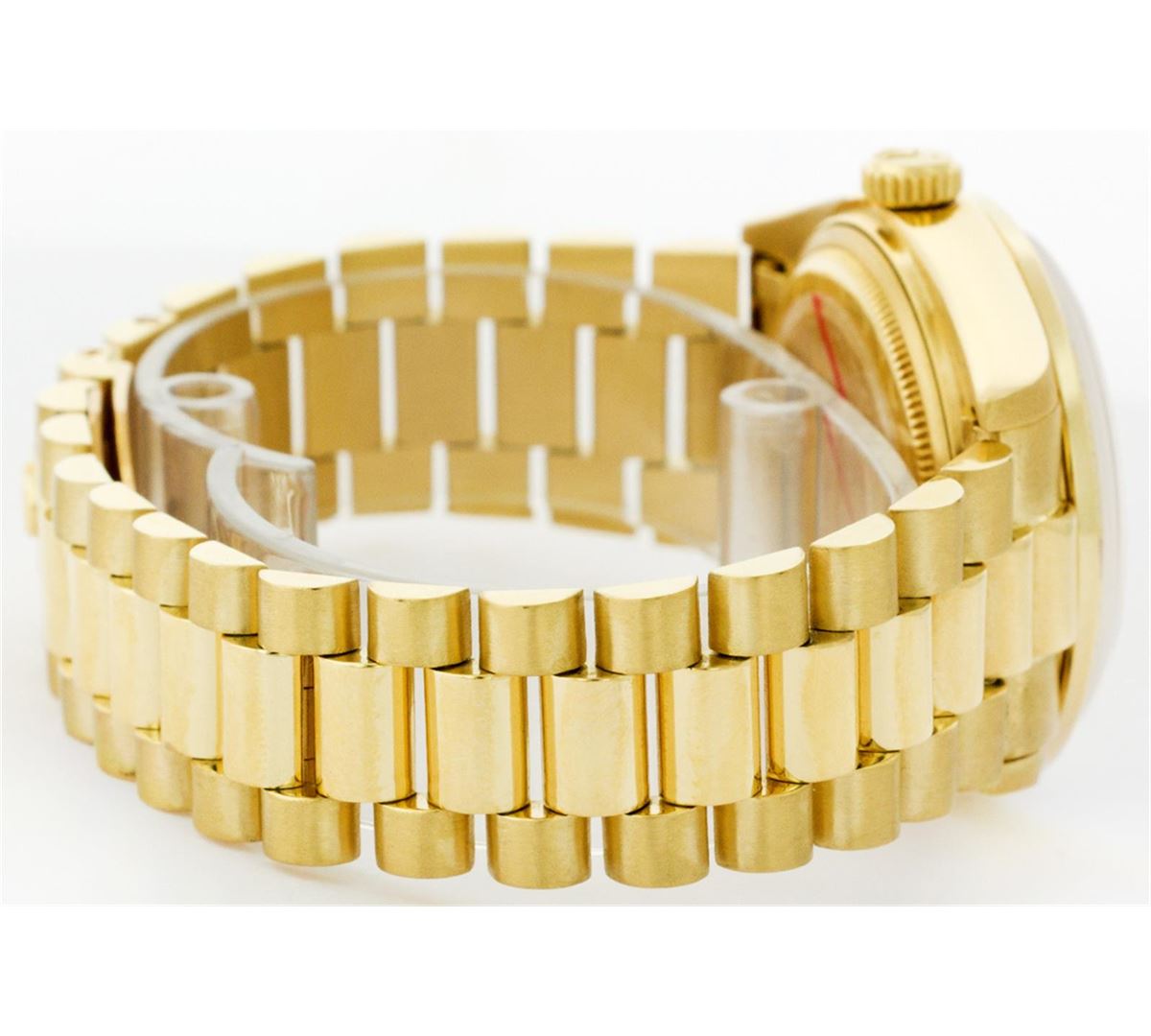 One Gents Rolex President Polished, Serviced & Electronically Tested, Yellow Gold Case:36mm, Yellow Gold Crown, Custom Bezel: 18K Yellow Gold Emerald Beadset Diamond Bezel, Diamond + Gem Count: 36 Diamonds + 4 Emeralds, Total Weight 1.00 Carat, Clarity: SI-VS, Color: G to H. Custom Crystal: Synthetic Sapphire Cyclops Lens. Movement: Automatic Winding Movement Caliber 3055. Custom Dial: Champagne Diamond Dial With Square Roman Track, Diamond Count: (8 Diamonds In Dial + 2 Baguette Diamonds In Dial) G To H In Color, Clarity: SI-VS. Date Window: 3 O'Clock Position Date Display, Day Window: 12 O'Clock Position Date Display. Quickset, Model: 18038 Condition: G-6 Extra Fine. Bracelet: Yellow Gold President. Bright Polish. 6.5 Inch Length, Standard Hidden Clasp President Clasp, With Rolex Logo.
