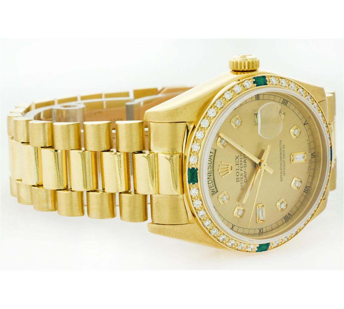One Gents Rolex President Polished, Serviced & Electronically Tested, Yellow Gold Case:36mm, Yellow Gold Crown, Custom Bezel: 18K Yellow Gold Emerald Beadset Diamond Bezel, Diamond + Gem Count: 36 Diamonds + 4 Emeralds, Total Weight 1.00 Carat, Clarity: SI-VS, Color: G to H. Custom Crystal: Synthetic Sapphire Cyclops Lens. Movement: Automatic Winding Movement Caliber 3055. Custom Dial: Champagne Diamond Dial With Square Roman Track, Diamond Count: (8 Diamonds In Dial + 2 Baguette Diamonds In Dial) G To H In Color, Clarity: SI-VS. Date Window: 3 O'Clock Position Date Display, Day Window: 12 O'Clock Position Date Display. Quickset, Model: 18038 Condition: G-6 Extra Fine. Bracelet: Yellow Gold President. Bright Polish. 6.5 Inch Length, Standard Hidden Clasp President Clasp, With Rolex Logo.