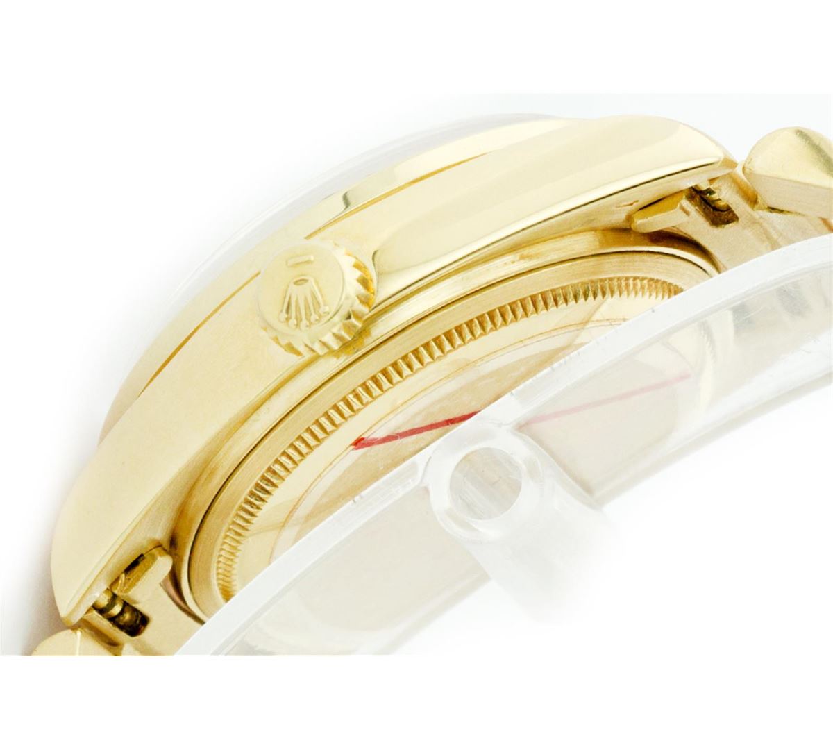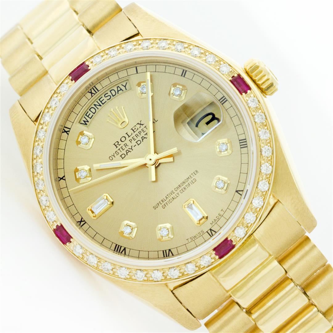 One Gents Rolex President Polished, Serviced & Electronically Tested, Yellow Gold Case:36mm, Yellow Gold Crown, Custom Diamond Lugs: 24 Diamonds In Lugs, Clarity SI-VS, Color: G to H Custom Bezel: 18K Yellow Gold Sapphire Beadset Diamond Bezel, Diamond + Gem Count: 36 Diamonds + 4 Sapphires Total Weight 1.00 Carat, Clarity: SI-VS, Color: G to H. Custom Crystal: Synthetic Sapphire Cyclops Lens. Movement: Automatic Winding Movement Caliber 3055. Custom Dial: Blue Vignette With Diamond Hour Markers, (8 Diamond In Dial + 2 Baguette Diamonds In Dial) G To H In Color, Clarity: SI-VS. Date Window: 3 O'Clock Position Date Display, Quickset, Model: 18038 Condition: G-6 Extra Fine. Bracelet: Yellow Gold President. Bright Polish. 6.5 Inch Length, Standard President Clasp, With Rolex Logo.