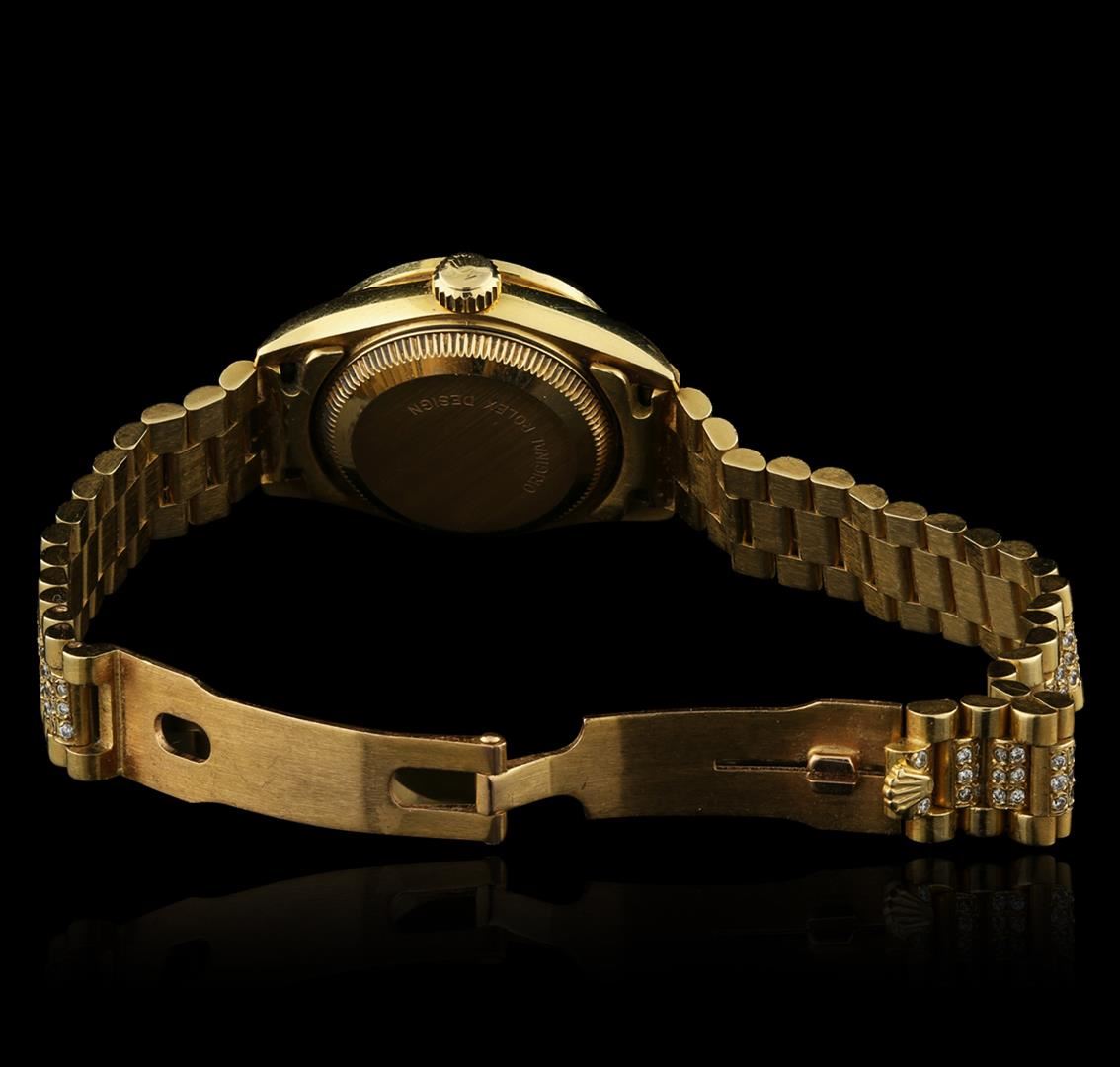 One ladies, hand crafted & machine milled Rolex Lady President, the DateJust model wristwatch electronically tested 18KT yellow gold, Case: 26mm oyster, Crown: twinlock with logo, Bezel: custom diamond, Crystal: custom synthetic sapphire cyclops lens. Movement: superlative chronometer automatic, Custom Dial: baton hands set above a field of pave, diamonds, Date Window: 3 o'clock position, quick set, Date Wheel: Champagne color, Customized Bracelet: 18KT yellow gold Super Lady President style, the center links are set throughout with diamonds, Condition: G-5 Fine. Circa: 1990, Bright polish finish. Six and one half inch length. Swiss Hallmarked Rolex concealed deployment clasp, with logo. Containing: Approximately Four Hundred Eighty round brilliant & single cut diamonds, measuring from 0.70mm in diameter up to 1.65mm in diameter, approximate total weight = 2.50ct. Set & graded in the bracelet, lugs, dial, and the bezel. Clarity VS-2 to SI-2 Average. Color: G - I. Total Weight of Diamonds 2.50ct. Total Weight of Watch 73.82gm. AIG Appraised at $23,440.00.
