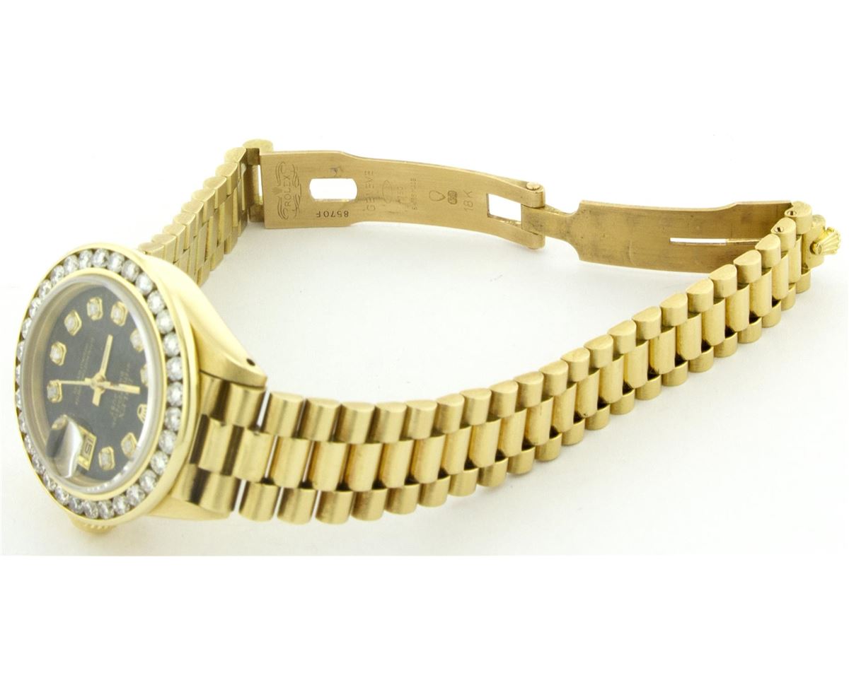One Ladies Rolex President Polished, Serviced & Electronically Tested, Yellow Gold Case: 26mm, Yellow Gold Crown, Custom Bezel: 18K Yellow Gold Channel Set Diamond Bezel, Diamond Count: 32 Diamonds Total Weight 2.5 Carat, Clarity: SI-VS, Color: G to H. Custom Crystal: Synthetic Sapphire Cyclops Lens. Movement: Automatic Winding Movement Caliber 2030. Dial: Black Jubilee With Diamond Hour Markers, Diamond Count: 10 Diamonds, Color: G to H, Clarity: SI-VS. Date Window: 3 O'Clock Position, Non Quickset, Model: 6917 Condition: G-6 Extra Fine. Bracelet: Yellow Gold President, Bright & Satin Polish. 5.5 Inch Length, Standard President Clasp (Hidden Clasp), With Rolex Logo.