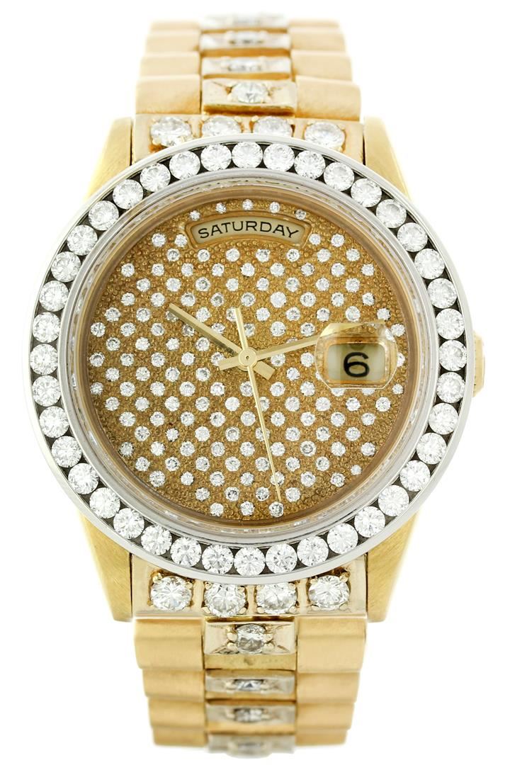 One Gents Rolex DayDate President Polished, Serviced & Electronically Tested, Yellow Gold Case:36mm, Yellow Gold Crown, Custom Bezel: 18K White Gold Channel Set Diamond Bezel, Diamond Count: 40 Diamonds Total Weight 3.5 Carat, Clarity: SI-VS, Color: G to H. Custom Crystal: Synthetic Sapphire Cyclops Lens. Movement: Automatic Winding Movement Caliber 3155. Custom Dial: Full Pave Diamond Dial, G To H In Color, Clarity: SI-VS. Date Window: 3 O'Clock Position, Day Display: 12 O'Clock Position, Double Quickset, Model: 18238 Condition: G-6 Extra Fine. Bracelet: Yellow Gold President with Custom Diamonds, Diamond Count: 29 Diamonds, Total Weight: 4.0 Carat, Polish. 6.5 Inch Length, Standard President Clasp, With Rolex Logo.