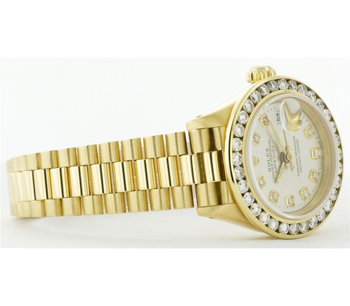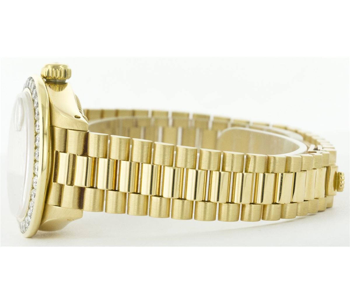 One Ladies Rolex President Polished, Serviced & Electronically Tested, Yellow Gold Case: 26mm, Yellow Gold Crown, Custom Bezel: 18K Yellow Gold Bead Set Diamond Bezel, Diamond Count: 32 Diamonds Total Weight .70 Carat, Clarity: SI-VS, Color: G to H. Custom Crystal: Synthetic Sapphire Cyclops Lens. Movement: Automatic Winding Movement Caliber 2030. Dial: Mother Of Pearl With String Diamond Dial, Color: G to H, Diamond Count: 43 Diamonds In Dial, Clarity: SI-VS. Date Window: 3 O'Clock Position, Model: 6917 Condition: G-6 Extra Fine. Bracelet: Yellow Gold President, Bright & Satin Polish. 5.5 Inch Length, Standard President Clasp (Hidden Clasp), With Rolex Logo.