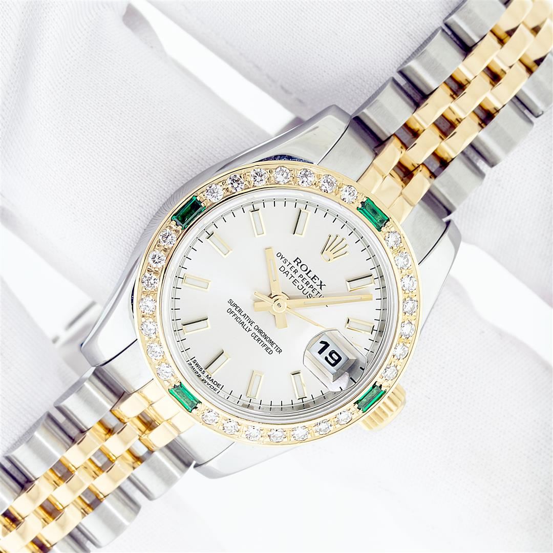 One Ladies Pre Owned Quickset Sapphire 2T 18K Yellow Gold & Stainless Steel Rolex Datejust Polished Bright with Satin Finish, Serviced & Electronically Tested, Rolex Stainless Steel Case: 26mm, Rolex 18K Yellow Gold Crown, Custom Bezel: New 18K Yellow Gold Emerald Beadset Diamond Bezel, Stone Count: 28 Diamonds + 4 Emeralds, Diamond Color: G To H, Clarity: SI-VS. Crystal: Sapphire With Magnified Date Window. Hands: Luminescent Hands. Rolex Movement: Automatic Winding Movement 2235. Rolex Dial: Silver Index With Dash Track. Date Window: 3 O'Clock Position Date Display, Model: Sapphire Quickset Datejust. Condition: G-6 Extra Fine. Rolex Bracelet: 18K Yellow Gold & Stainless Steel Jubilee Band. Bright Polish & Satin Finish. 6.0 Inch Length, Adjustable. Hidden Clap, With Rolex Logo. This Watch Has Been Serviced Time Tested And Is In Excellent Condition It Is Free Of All Scratches And Dents.