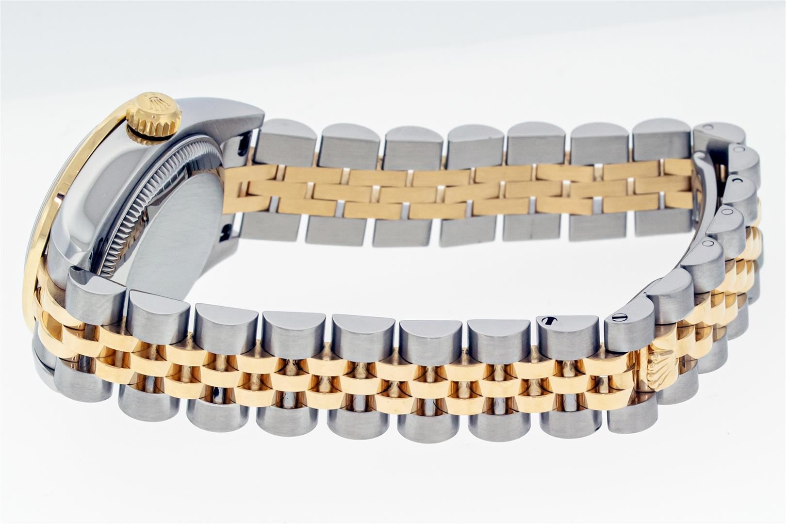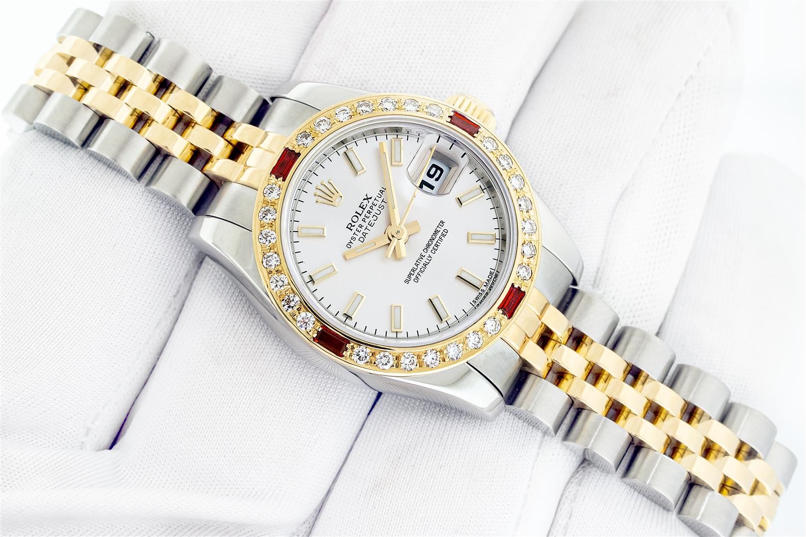 One Ladies Pre Owned Quickset Sapphire 2T 18K Yellow Gold & Stainless Steel Rolex Datejust Polished Bright with Satin Finish, Serviced & Electronically Tested, Rolex Stainless Steel Case: 26mm, Rolex 18K Yellow Gold Crown, Custom Bezel: New 18K Yellow Gold Ruby Beadset Diamond Bezel, Stone Count: 28 Diamonds + 4 Rubies, Diamond Color: G To H, Clarity: SI-VS. Crystal: Sapphire With Magnified Date Window. Hands: Luminescent Hands. Rolex Movement: Automatic Winding Movement 2235. Rolex Dial: Silver Index With Dash Track. Date Window: 3 O'Clock Position Date Display, Model: Sapphire Quickset Datejust. Condition: G-6 Extra Fine. Rolex Bracelet: 18K Yellow Gold & Stainless Steel Jubilee Band. Bright Polish & Satin Finish. 6.0 Inch Length, Adjustable. Hidden Clap, With Rolex Logo. This Watch Has Been Serviced Time Tested And Is In Excellent Condition It Is Free Of All Scratches And Dents.