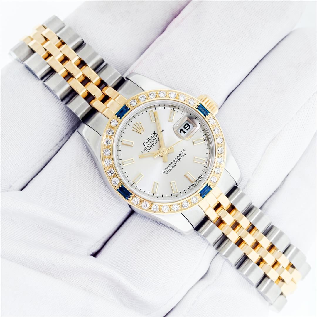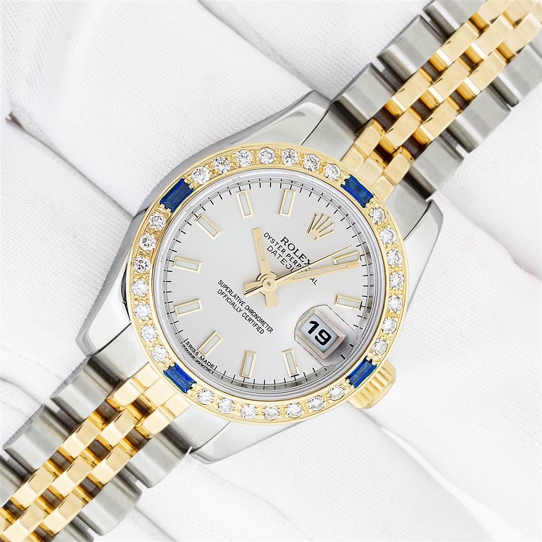 One Ladies Pre Owned Quickset Sapphire 2T 18K Yellow Gold & Stainless Steel Rolex Datejust Polished Bright with Satin Finish, Serviced & Electronically Tested, Rolex Stainless Steel Case: 26mm, Rolex 18K Yellow Gold Crown, Custom Bezel: New 18K Yellow Gold Sapphire Beadset Diamond Bezel, Stone Count: 28 Diamonds + 4 Sapphires, Diamond Color: G To H, Clarity: SI-VS. Crystal: Sapphire With Magnified Date Window. Hands: Luminescent Hands. Rolex Movement: Automatic Winding Movement 2235. Rolex Dial: Silver Index With Dash Track. Date Window: 3 O'Clock Position Date Display, Model: Sapphire Quickset Datejust. Condition: G-6 Extra Fine. Rolex Bracelet: 18K Yellow Gold & Stainless Steel Jubilee Band. Bright Polish & Satin Finish. 6.0 Inch Length, Adjustable. Hidden Clap, With Rolex Logo. This Watch Has Been Serviced Time Tested And Is In Excellent Condition It Is Free Of All Scratches And Dents.
