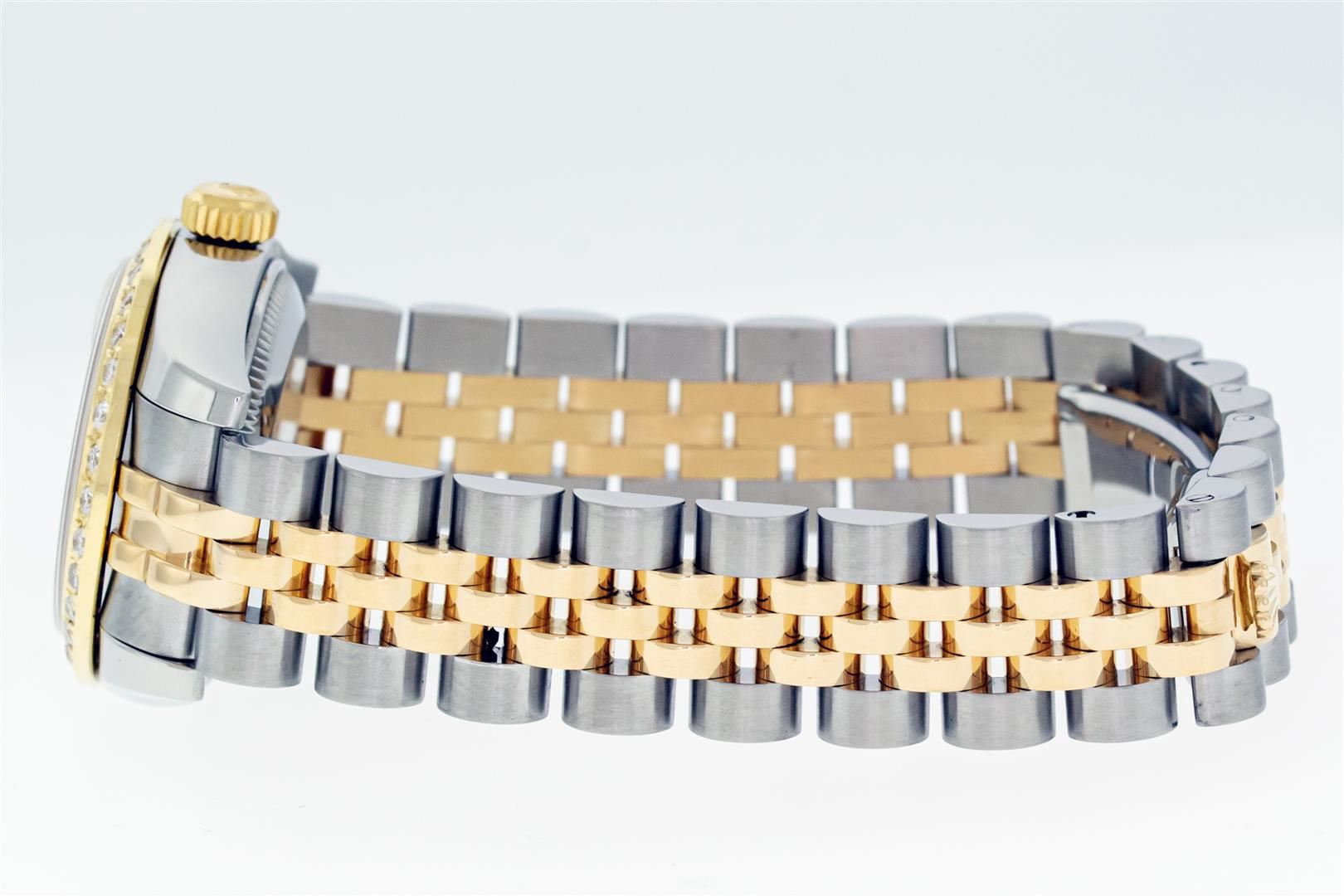 One Ladies Pre Owned Quickset Sapphire 2T 18K Yellow Gold & Stainless Steel Rolex Datejust Polished Bright with Satin Finish, Serviced & Electronically Tested, Rolex Stainless Steel Case: 26mm, Rolex 18K Yellow Gold Crown, Custom Bezel: New 18K Yellow Gold Beadset Diamond Bezel, Diamond Count: 32 Diamonds On Bezel, Diamond Color: G To H, Clarity: SI-VS. Crystal: Sapphire With Magnified Date Window. Hands: Luminescent Hands. Rolex Movement: Automatic Winding Movement 2235. Rolex Dial: Silver Index With Dash Track. Date Window: 3 O'Clock Position Date Display, Model: Sapphire Quickset Datejust. Condition: G-6 Extra Fine. Rolex Bracelet: 18K Yellow Gold & Stainless Steel Jubilee Band. Bright Polish & Satin Finish. 6.0 Inch Length, Adjustable. Hidden Clap, With Rolex Logo. This Watch Has Been Serviced Time Tested And Is In Excellent Condition It Is Free Of All Scratches And Dents.