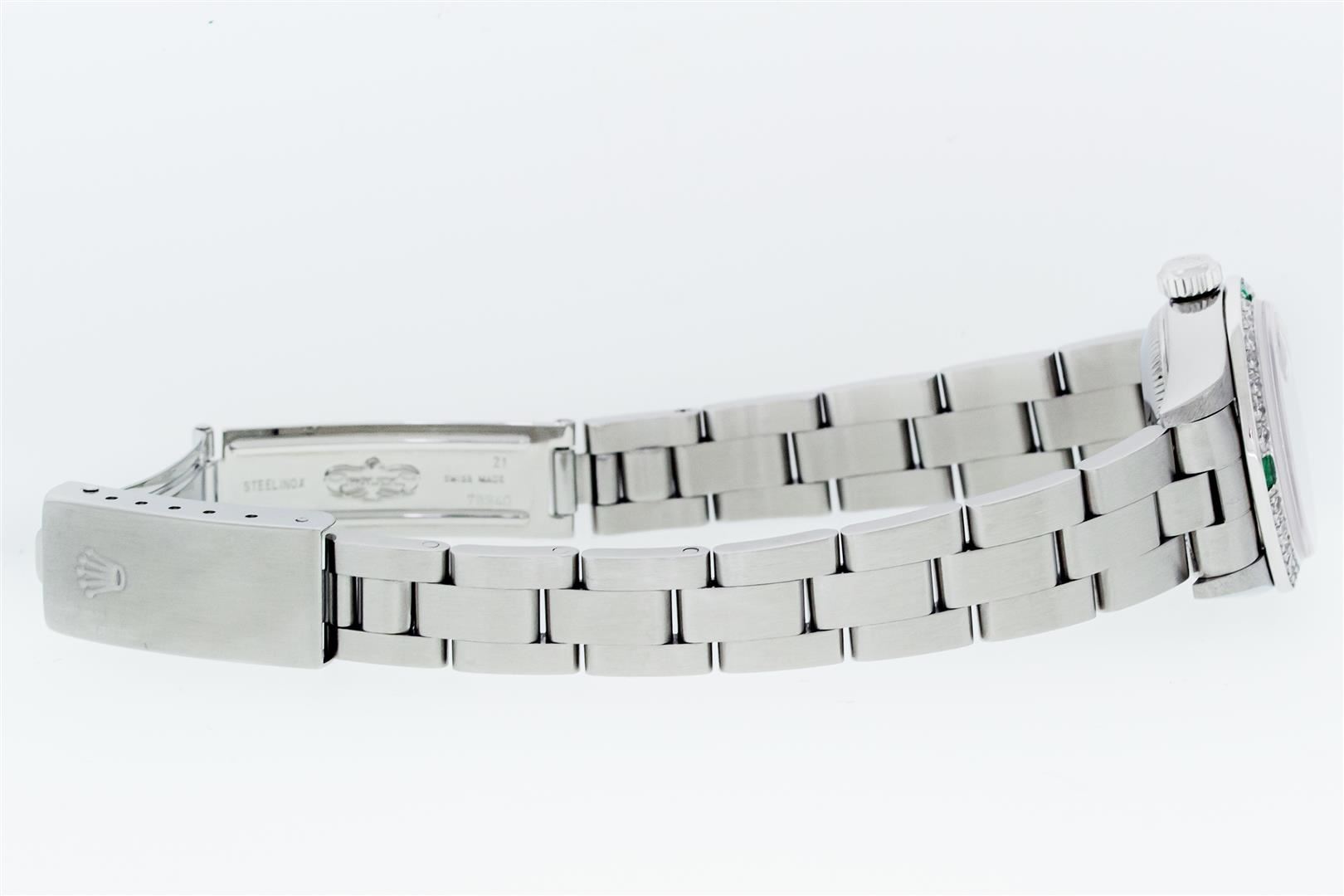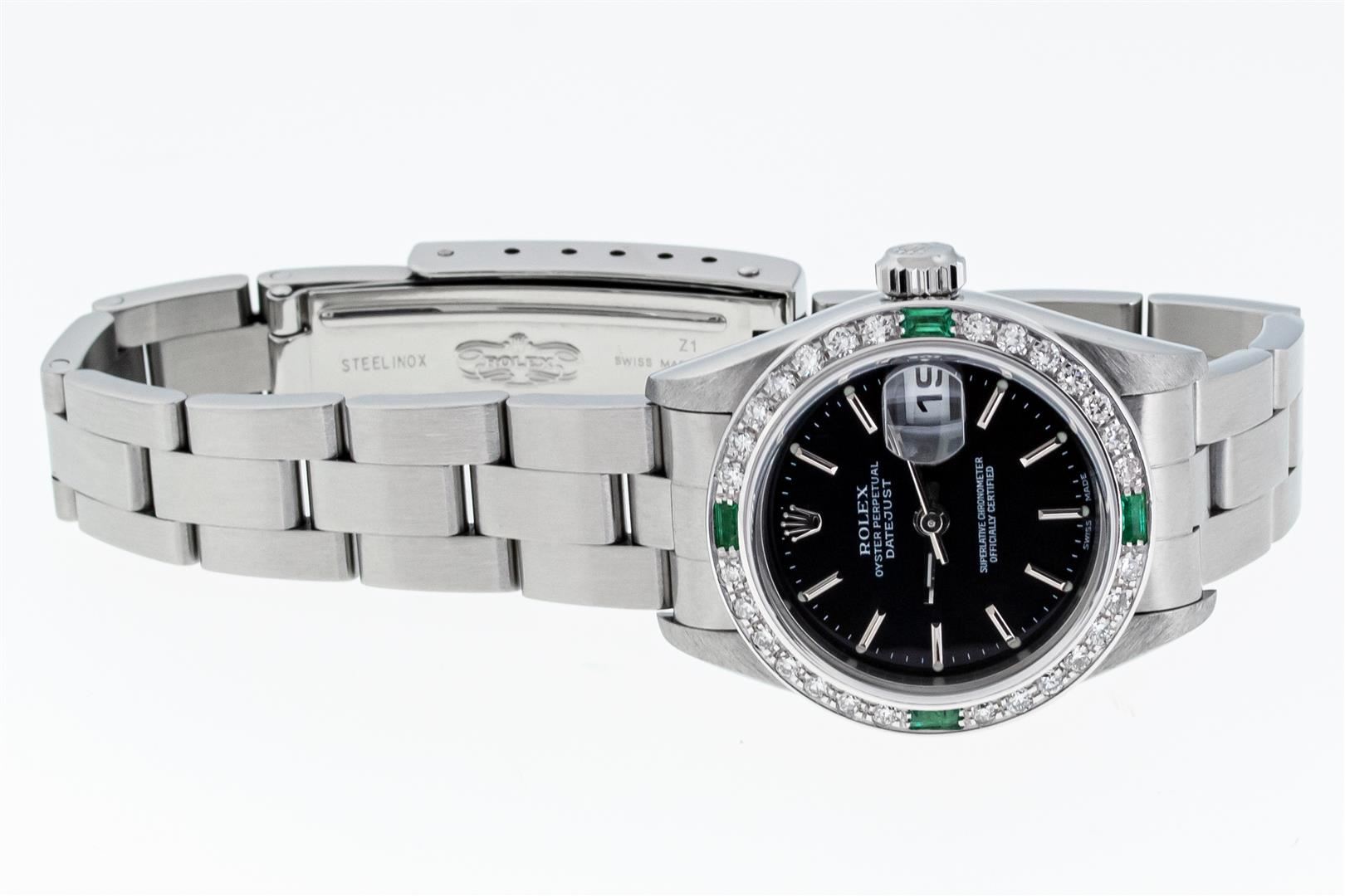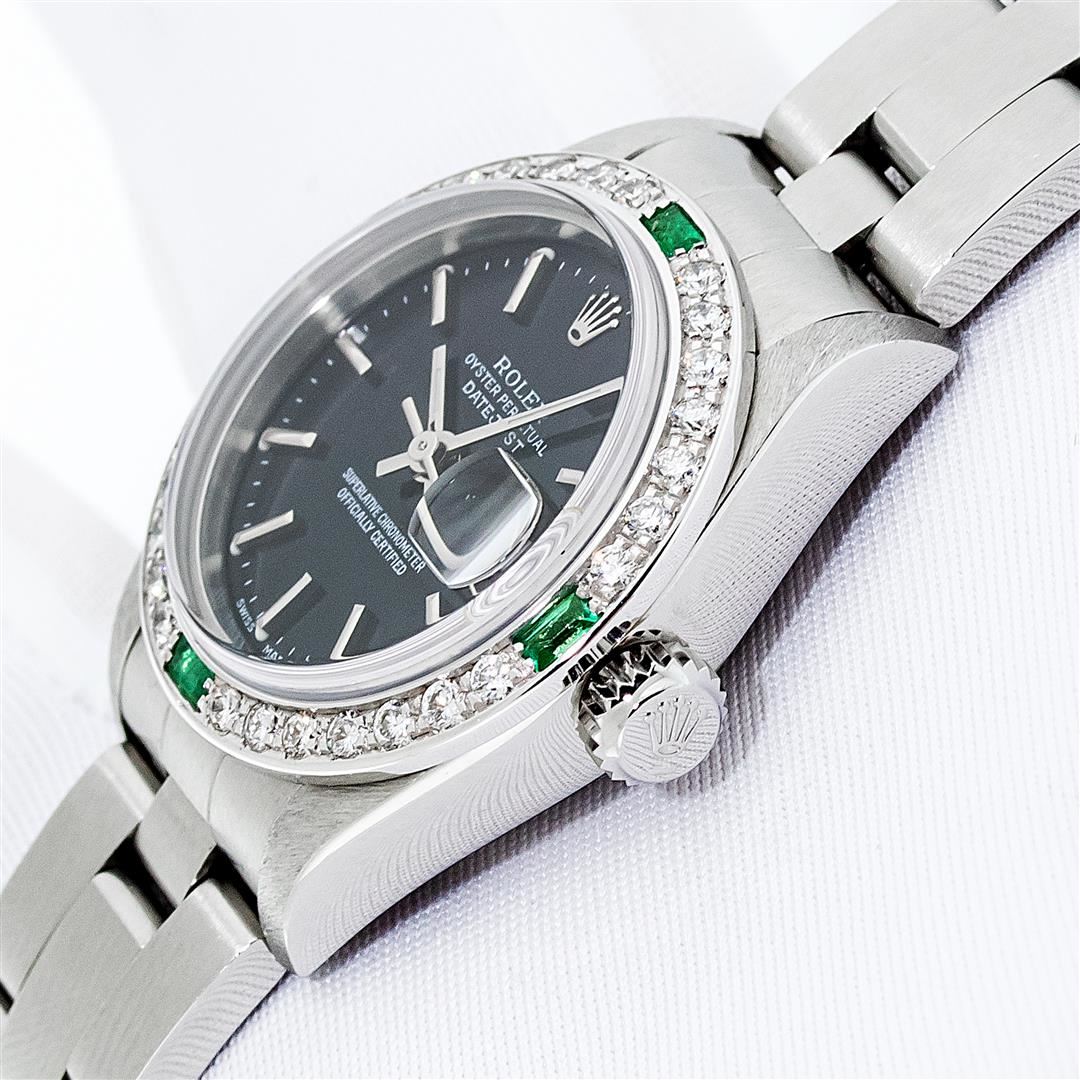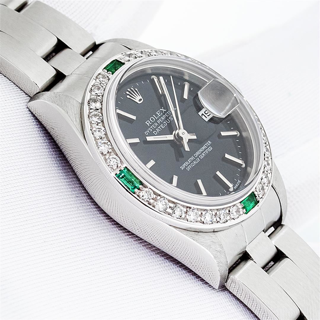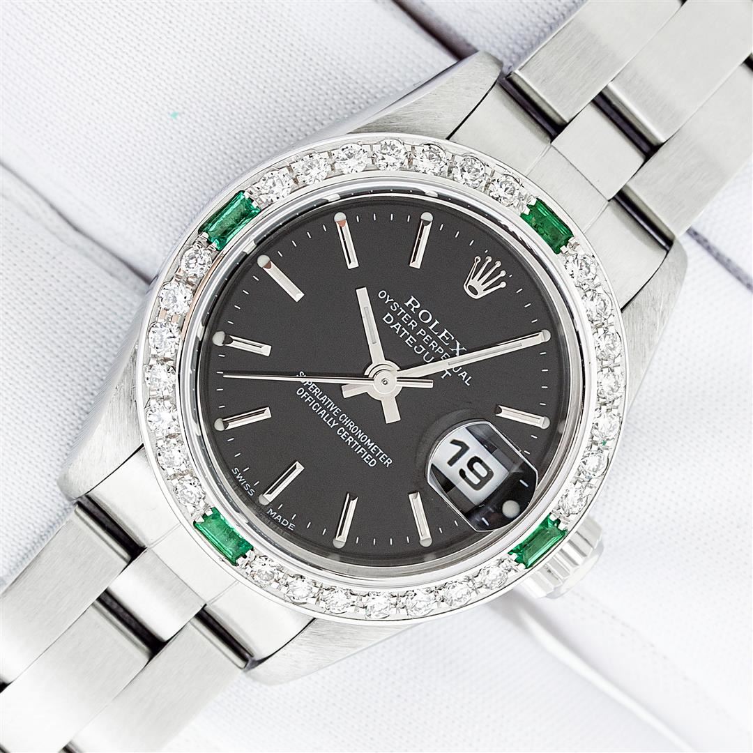 One Ladies Pre Owned Quickset Stainless Steel Rolex Datejust Polished Bright with Satin Finish, Serviced & Electronically Tested, Stainless Steel Case: 26mm, Rolex Stainless Steel Crown, Custom Bezel: New 18K White Gold Emerald Bead Set Diamond Bezel, Diamond + Gem Count: 28 Diamonds + 4 Emeralds. Custom Crystal: New Sapphire With Magnified Date Window. Custom Hands: New Luminescent Hands. Rolex Movement: Automatic Winding Movement 2235. Rolex Dial: Black With Index Hour Markers & Lumi Dots. Date Window: 3 O'Clock Position Date Display, Model: Quickset Datejust. Condition: G-6 Extra Fine. Rolex Bracelet: Stainless Steel Oyster Band. Bright Polish & Satin Finish. 6.0 Inch Length, Adjustable. Standard Clasp, With Rolex Logo. This Watch Has Been Serviced Time Tested And Is In Excellent Condition It Is Free Of All Scratches And Dents.