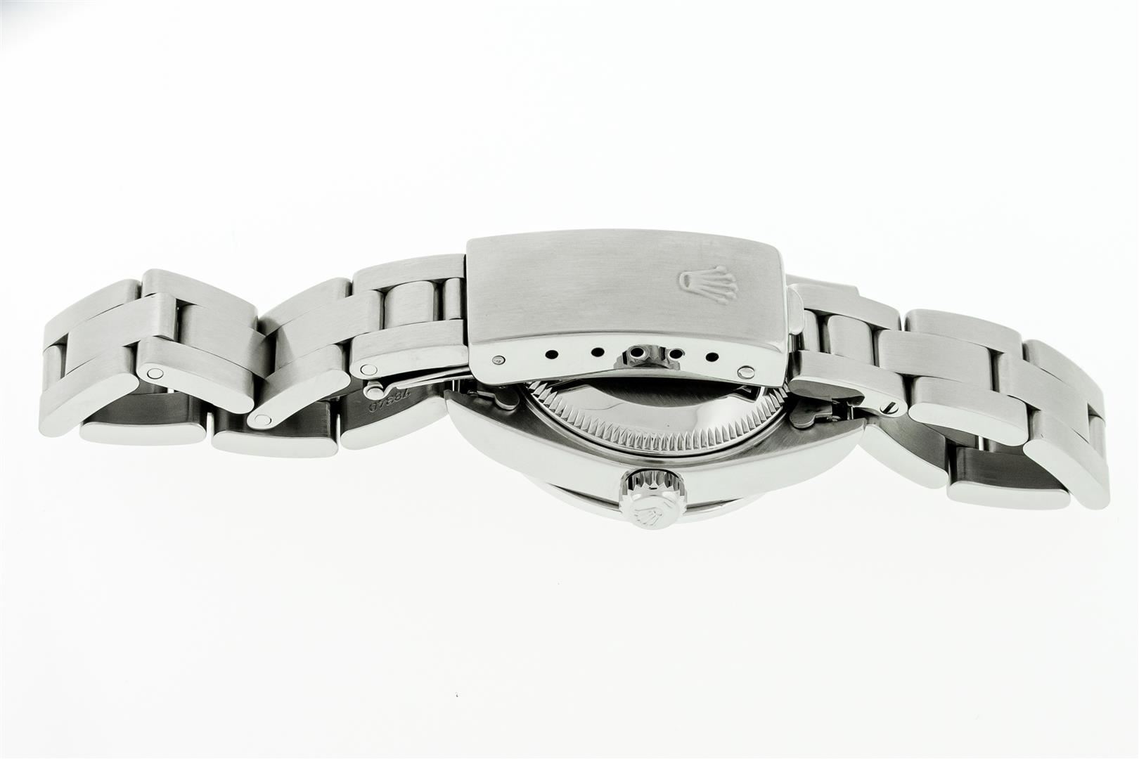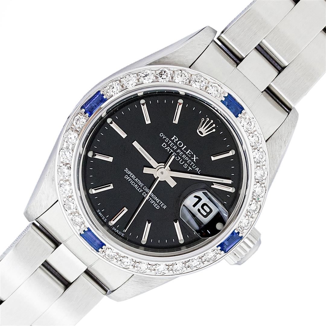 One Ladies Pre Owned Quickset Stainless Steel Rolex Datejust Polished Bright with Satin Finish, Serviced & Electronically Tested, Stainless Steel Case: 26mm, Rolex Stainless Steel Crown, Custom Bezel: New 18K White Gold Sapphire Bead Set Diamond Bezel, Diamond + Gem Count: 28 Diamonds + 4 Sapphires. Custom Crystal: New Sapphire With Magnified Date Window. Custom Hands: New Luminescent Hands. Rolex Movement: Automatic Winding Movement. Rolex Dial: Black With Index Hour Markers & Lumi Dots. Date Window: 3 O'Clock Position Date Display, Model: Datejust. Condition: G-6 Extra Fine. Rolex Bracelet: Stainless Steel Oyster Band. Bright Polish & Satin Finish. 6.0 Inch Length, Adjustable. Standard Clasp, With Rolex Logo. This Watch Has Been Serviced Time Tested And Is In Excellent Condition It Is Free Of All Scratches And Dents.