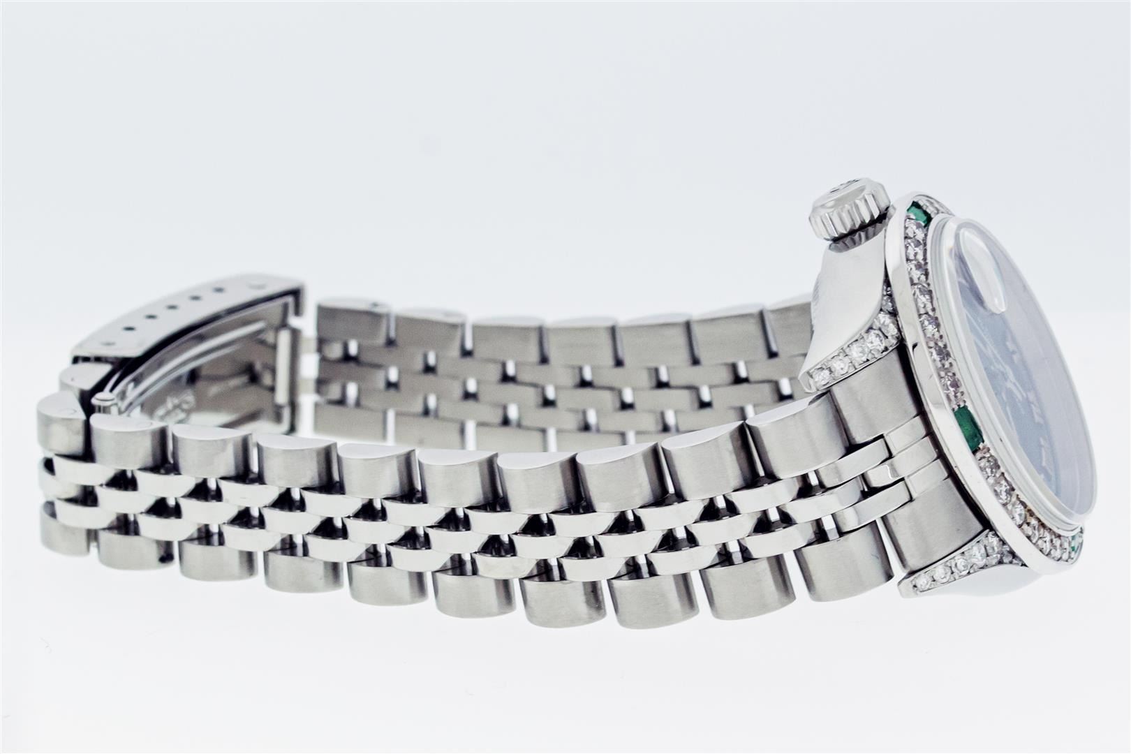 One Ladies Pre Owned Quickset Stainless Steel Rolex Datejust Polished Bright with Satin Finish, Serviced & Electronically Tested, Stainless Steel Case: 26mm, Custom Diamond Lugs: Added Diamonds On Lugs, Diamond Count: 24 Diamonds On Lugs. Rolex Stainless Steel Crown, Custom Bezel: New 18K White Gold Emerald Bead Set Diamond Bezel, Diamond + Gem Count: 28 Diamonds + 4 Emeralds. Custom Crystal: New Sapphire With Magnified Date Window. Custom Hands: New Hands. Rolex Movement: Automatic Winding Movement 2235. Rolex Dial: Blue With Roman Hour Markers & Square Track. Date Window: 3 O'Clock Position Date Display, Model: Quickset Datejust. Condition: G-6 Extra Fine. Rolex Bracelet: Stainless Steel Jubilee Band. Bright Polish & Satin Finish. 6.0 Inch Length, Adjustable. Standard Clasp, With Rolex Logo. This Watch Has Been Serviced Time Tested And Is In Excellent Condition It Is Free Of All Scratches And Dents.