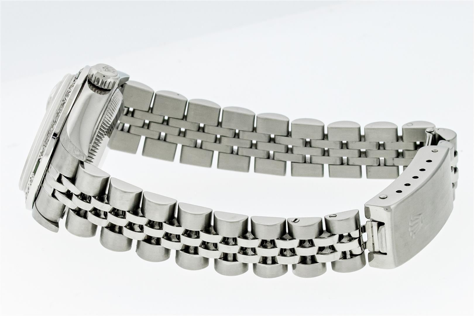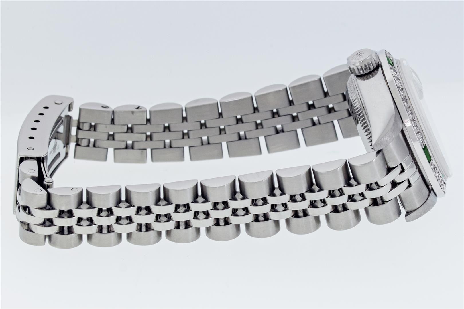 One Ladies Pre Owned Quickset Stainless Steel Rolex Datejust Polished Bright with Satin Finish, Serviced & Electronically Tested, Stainless Steel Case: 26mm. Rolex Stainless Steel Crown, Custom Bezel: New 18K White Gold Emerald Bead Set Diamond Bezel, Diamond + Gem Count: 28 Diamonds + 4 Emeralds. Custom Crystal: New Sapphire With Magnified Date Window. Custom Hands: New Hands. Rolex Movement: Automatic Winding Movement 2235. Rolex Dial: Gray With Roman Hour Markers & Square Track. Date Window: 3 O'Clock Position Date Display, Model: Quickset Datejust. Condition: G-6 Extra Fine. Rolex Bracelet: Stainless Steel Jubilee Band. Bright Polish & Satin Finish. 6.0 Inch Length, Adjustable. Standard Clasp, With Rolex Logo. This Watch Has Been Serviced Time Tested And Is In Excellent Condition It Is Free Of All Scratches And Dents.