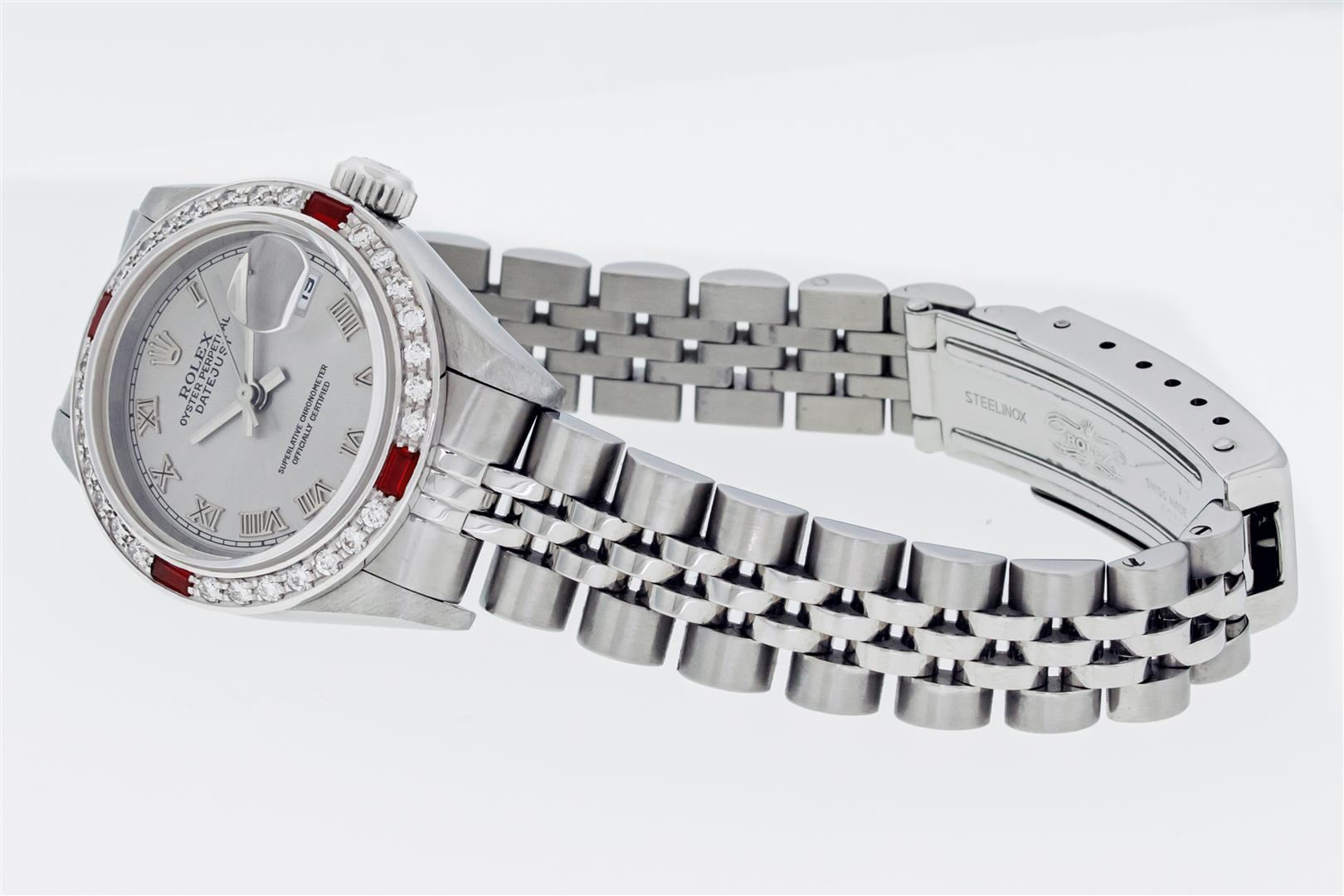 One Ladies Pre Owned Quickset Stainless Steel Rolex Datejust Polished Bright with Satin Finish, Serviced & Electronically Tested, Stainless Steel Case: 26mm. Rolex Stainless Steel Crown, Custom Bezel: New 18K White Gold Ruby Bead Set Diamond Bezel, Diamond + Gem Count: 28 Diamonds + 4 Rubies. Custom Crystal: New Sapphire With Magnified Date Window. Custom Hands: New Hands. Rolex Movement: Automatic Winding Movement 2235. Rolex Dial: Gray With Roman Hour Markers & Square Track. Date Window: 3 O'Clock Position Date Display, Model: Quickset Datejust. Condition: G-6 Extra Fine. Rolex Bracelet: Stainless Steel Jubilee Band. Bright Polish & Satin Finish. 6.0 Inch Length, Adjustable. Standard Clasp, With Rolex Logo. This Watch Has Been Serviced Time Tested And Is In Excellent Condition It Is Free Of All Scratches And Dents.