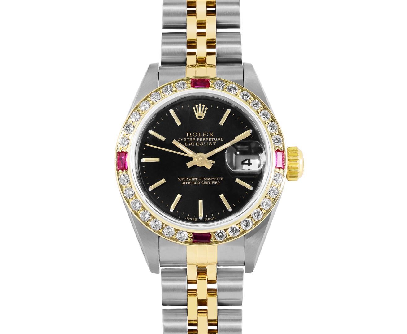 Rolex Ladies Pre Owned Quickset 18K Yellow Gold and Stainless Steel Two Tone Wristwatch Polished Bright with Satin Finish, Serviced & Electronically Tested, Rolex Case: 26mm, Rolex Yellow Gold Crown, Custom Bezel: New 18K Yellow Gold Beadset And Ruby Diam