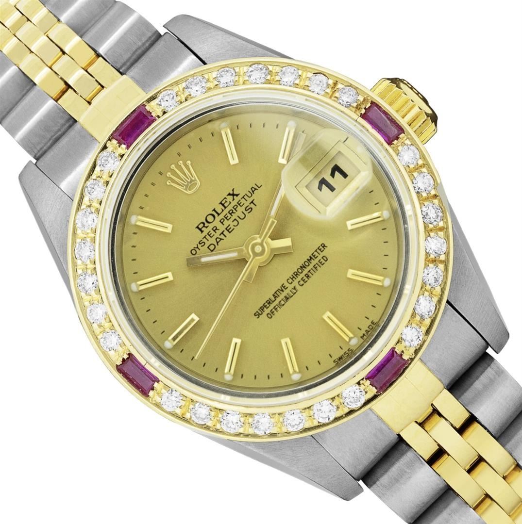 One Rolex Ladies Pre Owned Two Tone 18K Yellow Gold & Stainless Steel Rolex Datejust Polished, Serviced & Electronically Tested, Rolex Yellow Gold & Stainless Steel Case: 26mm, Rolex Yellow Gold Crown, Custom Bezel: New 18K Yellow Gold Ruby Beadset Diamond Bezel, Diamond + Gem Count: 36 Diamonds + 4 Rubies, Clarity: SI-VS, Color: G to H. Custom Crystal: New Sapphire With Magnifying Date Window. Hands: Luminescent Hands. Rolex Movement: 2235 Automatic Winding Quickset Movement. Rolex Factory Dial: Champagne Dial With Index Hour Markers, Dash Track, and Lumi Dots. Date Window: 3 O'Clock Position Date Display, Condition: G-6 Extra Fine. Rolex Bracelet: Two Tone 18K Yellow Gold & Stainless Steel Jubilee Band. Bright Polish & Satin Finish. 6.0 Inch Length, Adjustable. Fold Clasp, With Rolex Logo. This Watch Has Been Serviced And Time Tested. It Is In Excellent Condition, Free Of All Scratches And Dents. This Watch Comes With A Rolex Box.