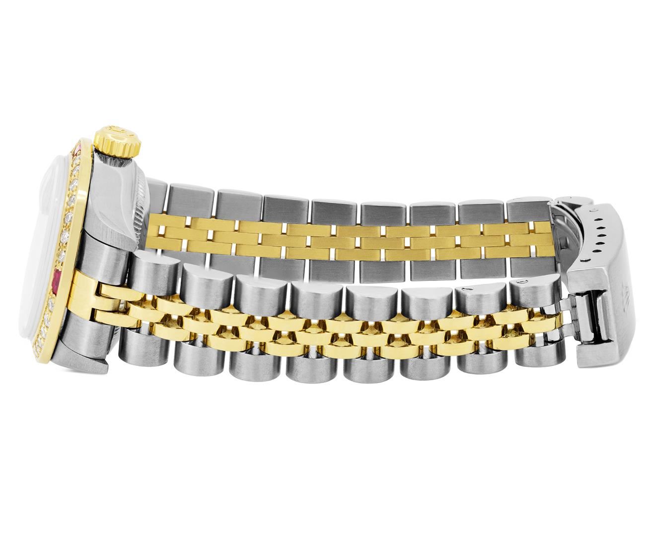 One Rolex Ladies Pre Owned Two Tone 18K Yellow Gold & Stainless Steel Rolex Datejust Polished, Serviced & Electronically Tested, Rolex Yellow Gold & Stainless Steel Case: 26mm, Rolex Yellow Gold Crown, Custom Bezel: New 18K Yellow Gold Ruby Beadset Diamond Bezel, Diamond + Gem Count: 36 Diamonds + 4 Rubies, Clarity: SI-VS, Color: G to H. Custom Crystal: New Sapphire With Magnifying Date Window. Hands: Luminescent Hands. Rolex Movement: 2235 Automatic Winding Quickset Movement. Rolex Factory Dial: Champagne Dial With Index Hour Markers, Dash Track, and Lumi Dots. Date Window: 3 O'Clock Position Date Display, Condition: G-6 Extra Fine. Rolex Bracelet: Two Tone 18K Yellow Gold & Stainless Steel Jubilee Band. Bright Polish & Satin Finish. 6.0 Inch Length, Adjustable. Fold Clasp, With Rolex Logo. This Watch Has Been Serviced And Time Tested. It Is In Excellent Condition, Free Of All Scratches And Dents. This Watch Comes With A Rolex Box.