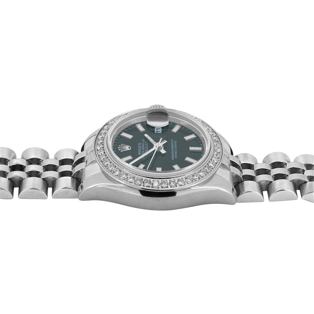 One Rolex Ladies Sapphire Quickset Pre Owned Stainless Steel Datejust Wristwatch Polished Bright with Satin Finish, Serviced & Electronically Tested, Stainless Steel Case: 26mm, Stainless Steel Crown, Custom Bezel: New Stainless Steel Beadset Diamond Bezel, Diamond Count: 40 Diamonds On Bezel. Crystal: Sapphire With Magnified Date Window. Hands: Luminescent Hands. Rolex Movement: 2235 Automatic Winding Movement. Rolex Dial: Factory Black Luminescent Dial With Index Hour Markers. Date Window: 3 O'Clock Position Date Display, Model: Sapphire Quickset Datejust. Condition: G-6 Extra Fine. Rolex Bracelet: Stainless Steel Jubilee Band With Hidden Clasp. Bright Polish & Satin Finish. 6.0 Inch Length, Adjustable. Hidden Clasp, With Rolex Logo. This Watch Has Been Serviced And Time Tested. It Is In Excellent Condition, Free Of All Scratches And Dents.