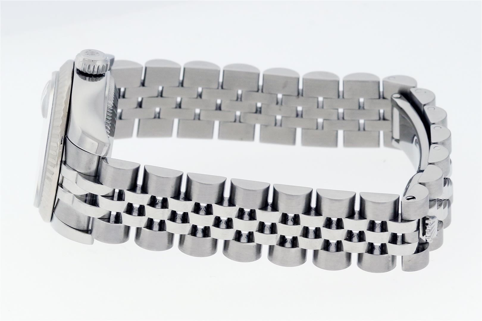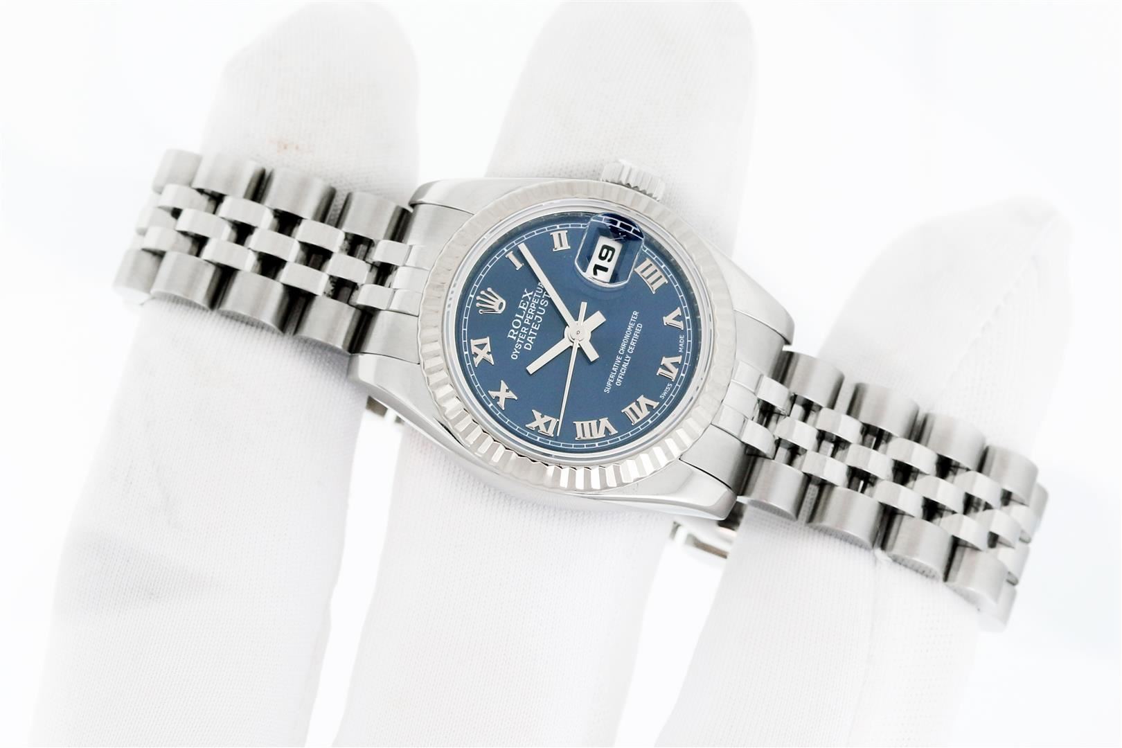One Ladies Pre Owned Quickset Sapphire Stainless Steel Rolex Datejust Polished Bright with Satin Finish, Serviced & Electronically Tested, Rolex Stainless Steel Case: 26mm, Rolex Stainless Steel Crown, Rolex Bezel: 18K White Gold Fluted Bezel. Crystal: Sapphire With Magnified Date Window. Hands: Luminescent Hands. Rolex Movement: Automatic Winding Movement 2235. Rolex Dial: Blue With Roman Hour Markers With Square Track. Date Window: 3 O'Clock Position Date Display, Model: Sapphire Quickset Datejust. Condition: G-6 Extra Fine. Rolex Bracelet: Stainless Steel Jubilee Band. Bright Polish & Satin Finish. 6.0 Inch Length, Adjustable. Hidden Clap, With Rolex Logo. This Watch Has Been Serviced Time Tested And Is In Excellent Condition It Is Free Of All Scratches And Dents.