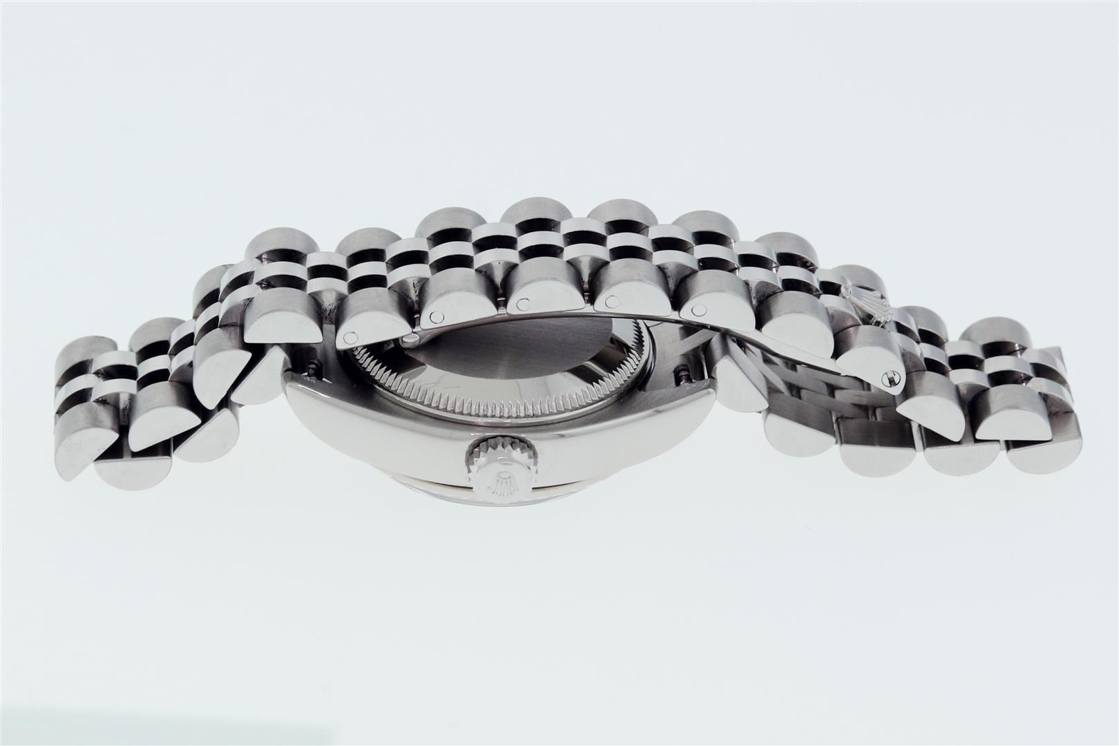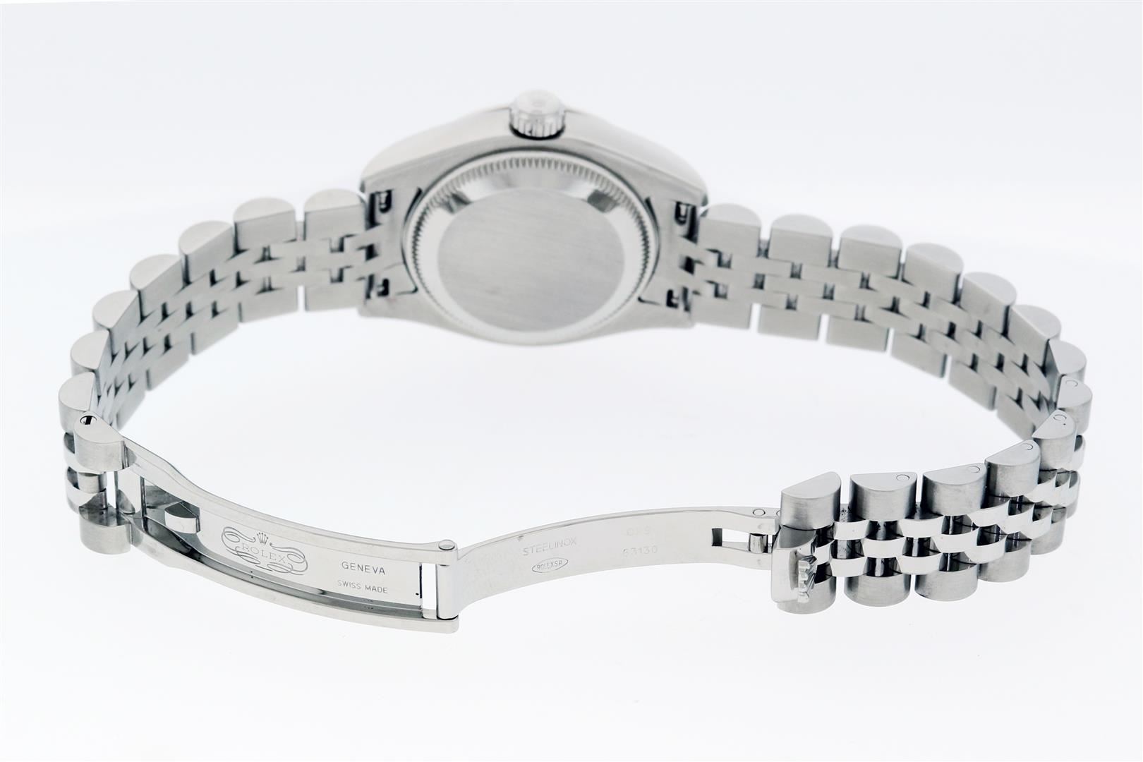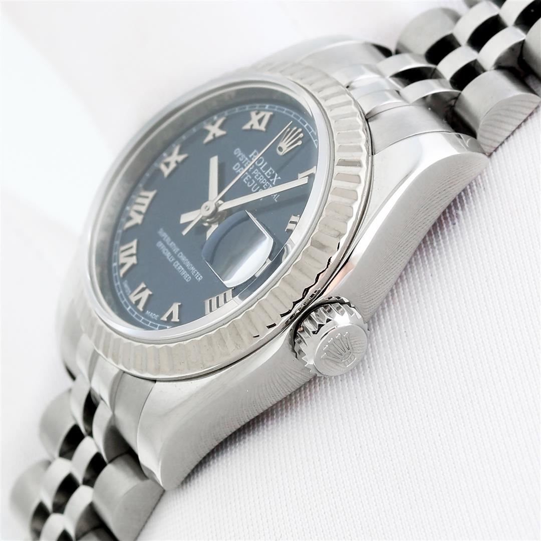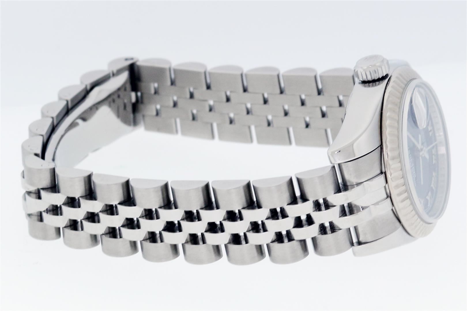 One Ladies Pre Owned Quickset Sapphire Stainless Steel Rolex Datejust Polished Bright with Satin Finish, Serviced & Electronically Tested, Rolex Stainless Steel Case: 26mm, Rolex Stainless Steel Crown, Rolex Bezel: 18K White Gold Fluted Bezel. Crystal: Sapphire With Magnified Date Window. Hands: Luminescent Hands. Rolex Movement: Automatic Winding Movement 2235. Rolex Dial: Blue With Roman Hour Markers With Square Track. Date Window: 3 O'Clock Position Date Display, Model: Sapphire Quickset Datejust. Condition: G-6 Extra Fine. Rolex Bracelet: Stainless Steel Jubilee Band. Bright Polish & Satin Finish. 6.0 Inch Length, Adjustable. Hidden Clap, With Rolex Logo. This Watch Has Been Serviced Time Tested And Is In Excellent Condition It Is Free Of All Scratches And Dents.