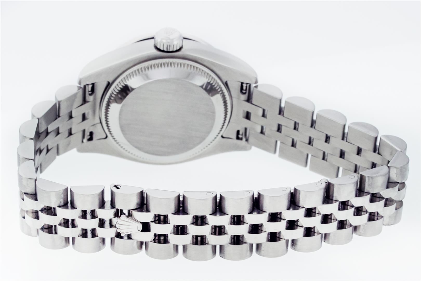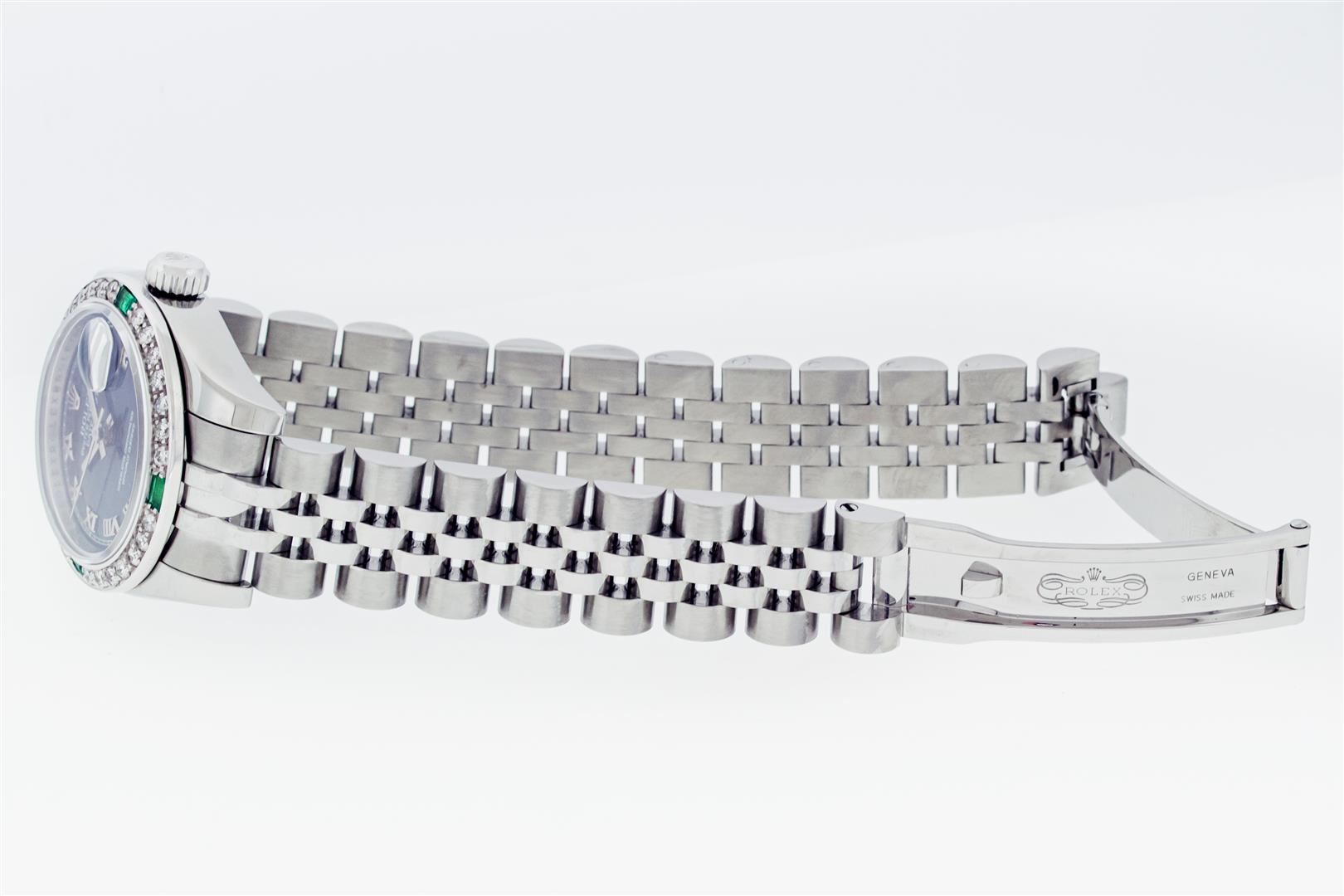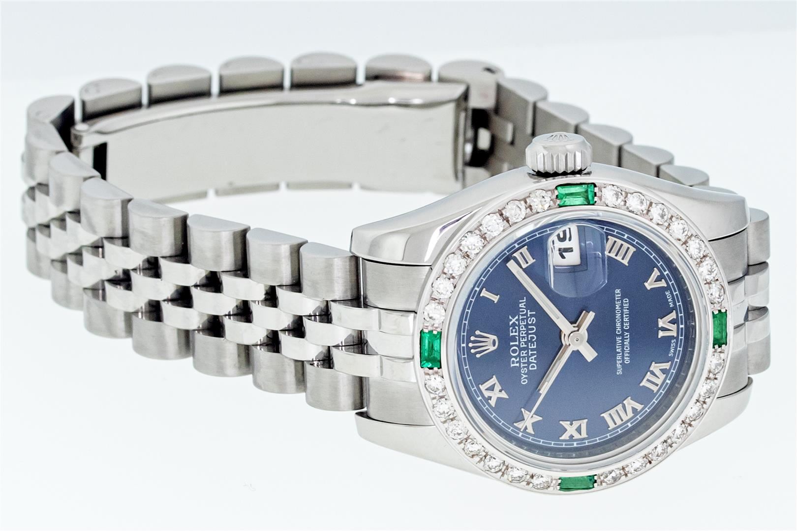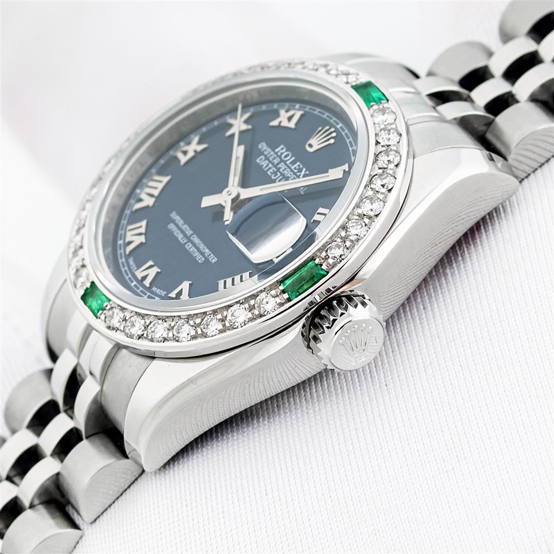 One Ladies Pre Owned Sapphire Quickset Stainless Steel Rolex Datejust Polished Bright with Satin Finish, Serviced & Electronically Tested, Rolex Stainless Steel Case: 26mm, Rolex Stainless Steel Crown, Custom Bezel: New 18K White Gold Diamond & Emerald Bezel, Stone Count: 28 Diamonds + 4 Emeralds. Crystal: Sapphire With Magnified Date Window. Hands: Luminescent Hands. Rolex Movement: Automatic Winding Movement 2235. Rolex Dial: Blue Roman With Square Track. Date Window: 3 O'Clock Position Date Display, Model: Quickset Datejust. Condition: G-6 Extra Fine. Rolex Bracelet: Stainless Steel Jubilee Band. Bright Polish & Satin Finish. 6.0 Inch Length, Adjustable. Hidden Clap, With Rolex Logo. This Watch Has Been Serviced Time Tested And Is In Excellent Condition It Is Free Of All Scratches And Dents.