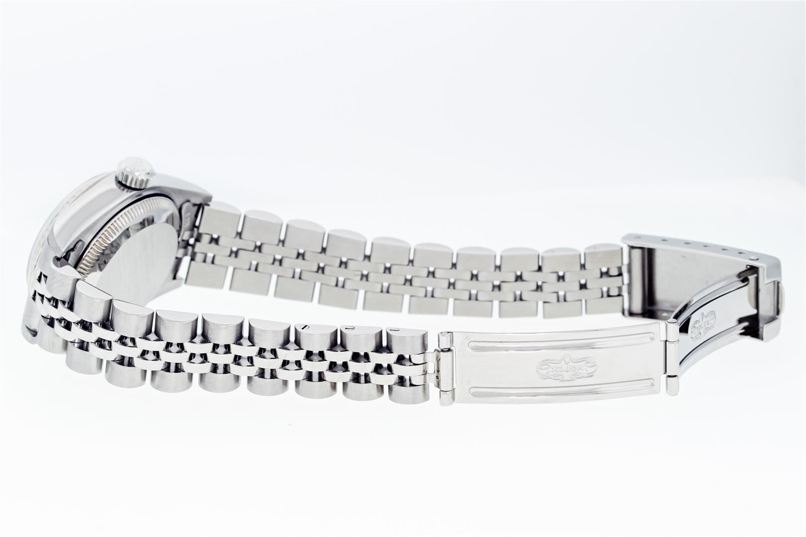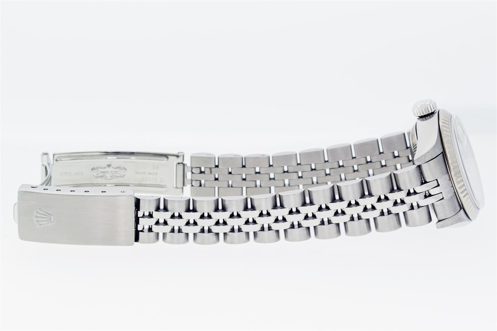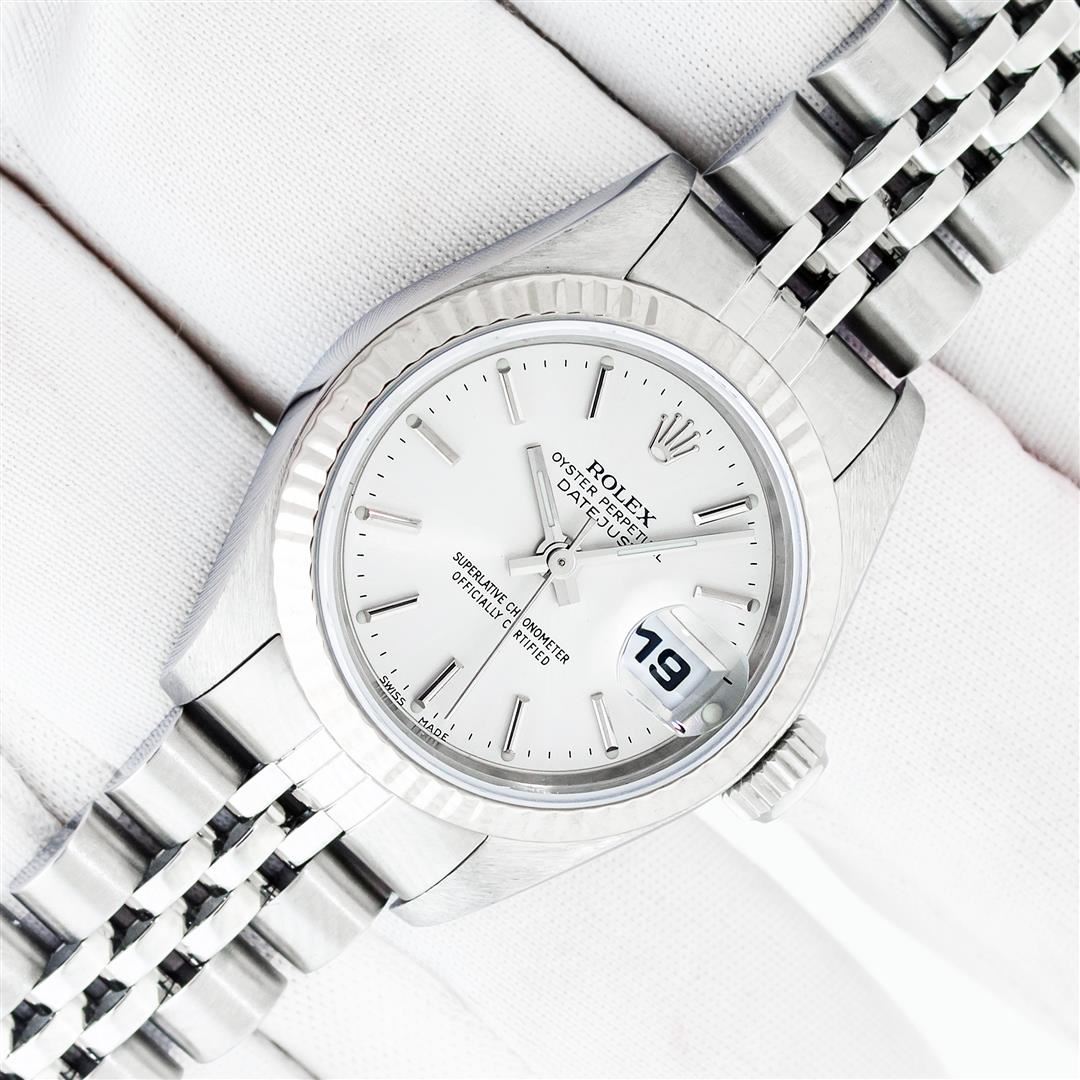 One Ladies Pre Owned Quickset Stainless Steel Rolex Datejust Polished Bright with Satin Finish, Serviced & Electronically Tested, Stainless Steel Case: 26mm, Rolex Stainless Steel Crown, Rolex Bezel: 18K White Gold Fluted Bezel. Crystal: Sapphire With Magnified Date Window. Custom Hands: Luminescent Hands. Rolex Movement: Automatic Winding Movement 2235. Rolex Dial: Silver Index With Dash Track & Lumi Dots. Date Window: 3 O'Clock Position Date Display, Model: Quickset Datejust. Condition: G-6 Extra Fine. Rolex Bracelet: Stainless Steel Jubilee Band. Bright Polish & Satin Finish. 6.0 Inch Length, Adjustable. Standard Clasp, With Rolex Logo. This Watch Has Been Serviced Time Tested And Is In Excellent Condition It Is Free Of All Scratches And Dents.