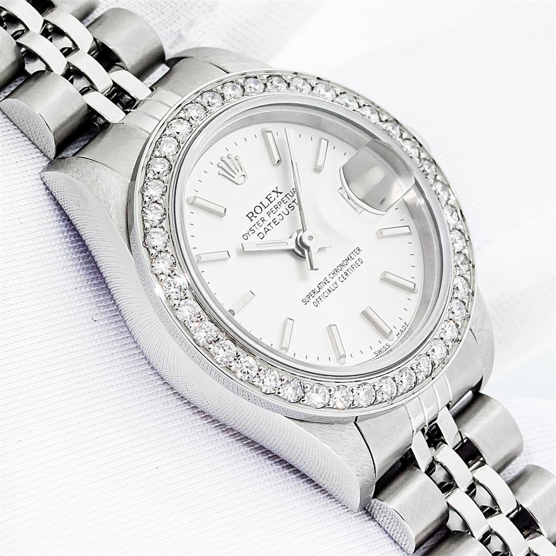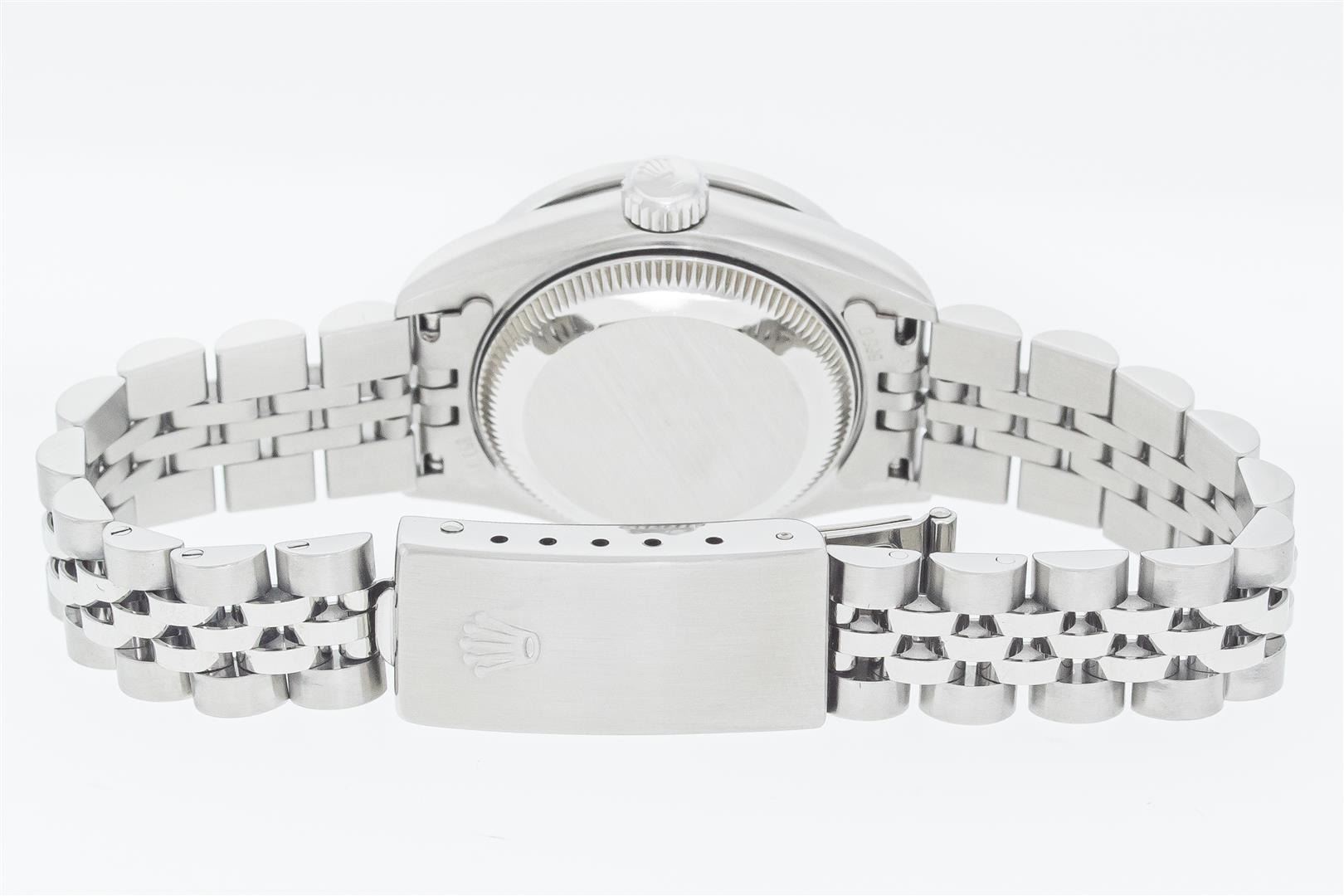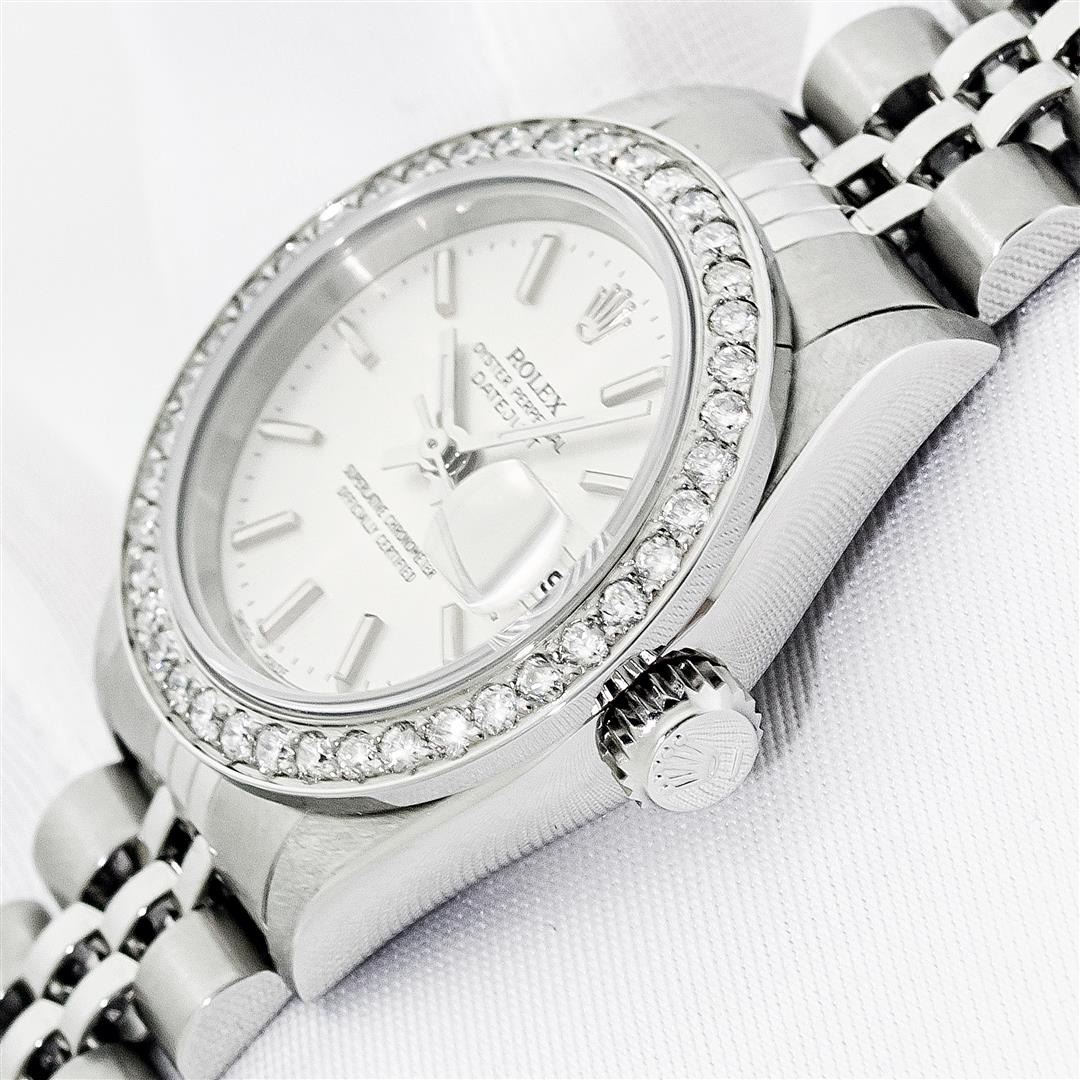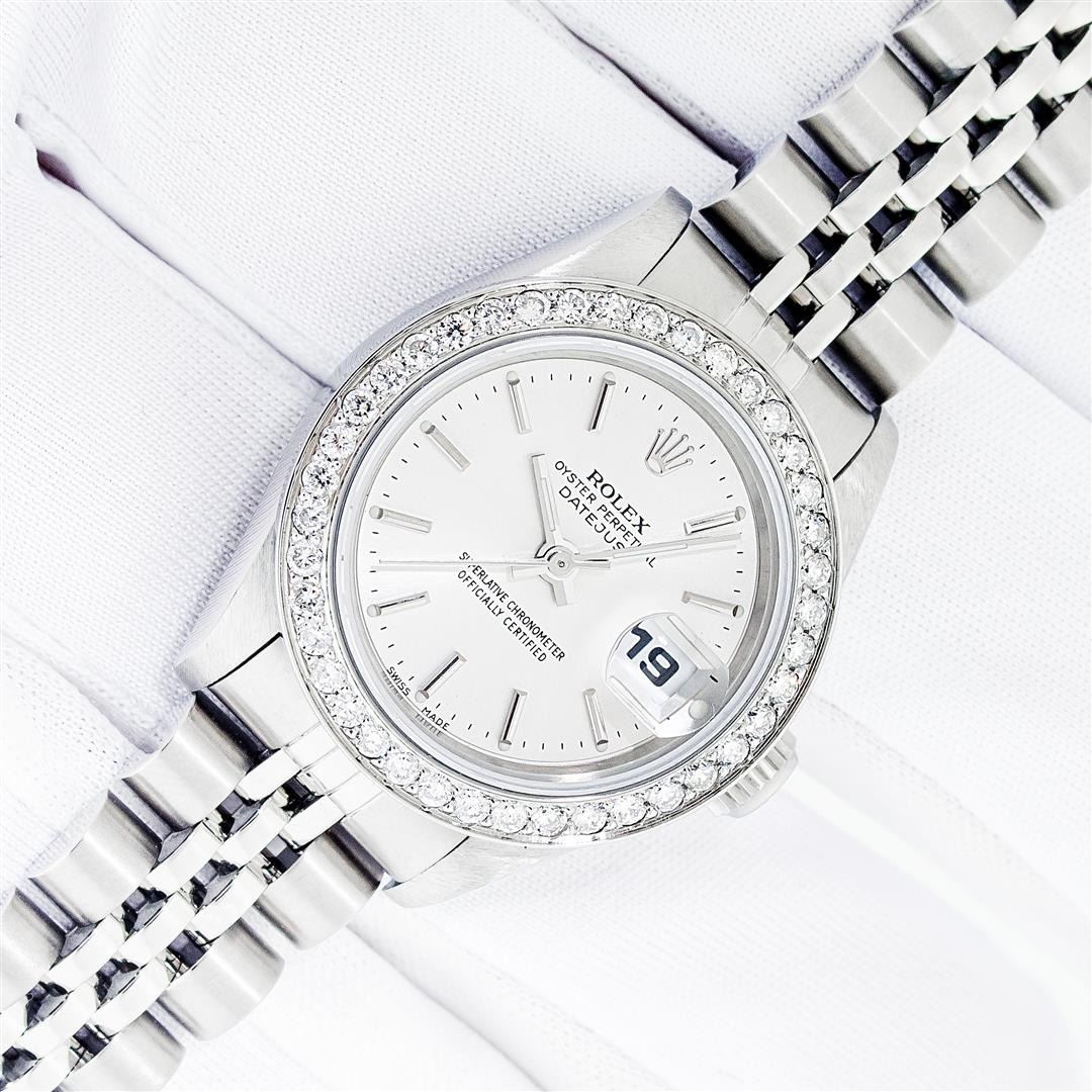 One Ladies Pre Owned Stainless Steel Rolex Datejust Polished Bright with Satin Finish, Serviced & Electronically Tested, Stainless Steel Case: 26mm, Rolex Stainless Steel Crown, Custom Bezel: New Stainless Steel Diamond Bezel, Diamond Count: 40 Diamonds On Bezel. Custom Crystal: New Sapphire With Magnified Date Window. Custom Hands: New Luminescent Hands. Rolex Movement: Automatic Winding Quickset Movement 2235. Rolex Dial: Silver With Index Hour Markers And Lumi Dots. Date Window: 3 O'Clock Position Date Display, Model: Quickset Datejust. Condition: G-6 Extra Fine. Rolex Bracelet: Stainless Steel Jubilee Band. Bright Polish & Satin Finish. 6.0 Inch Length, Adjustable. Standard Clasp, With Rolex Logo. This Watch Has Been Serviced Time Tested And Is In Excellent Condition It Is Free Of All Scratches And Dents.