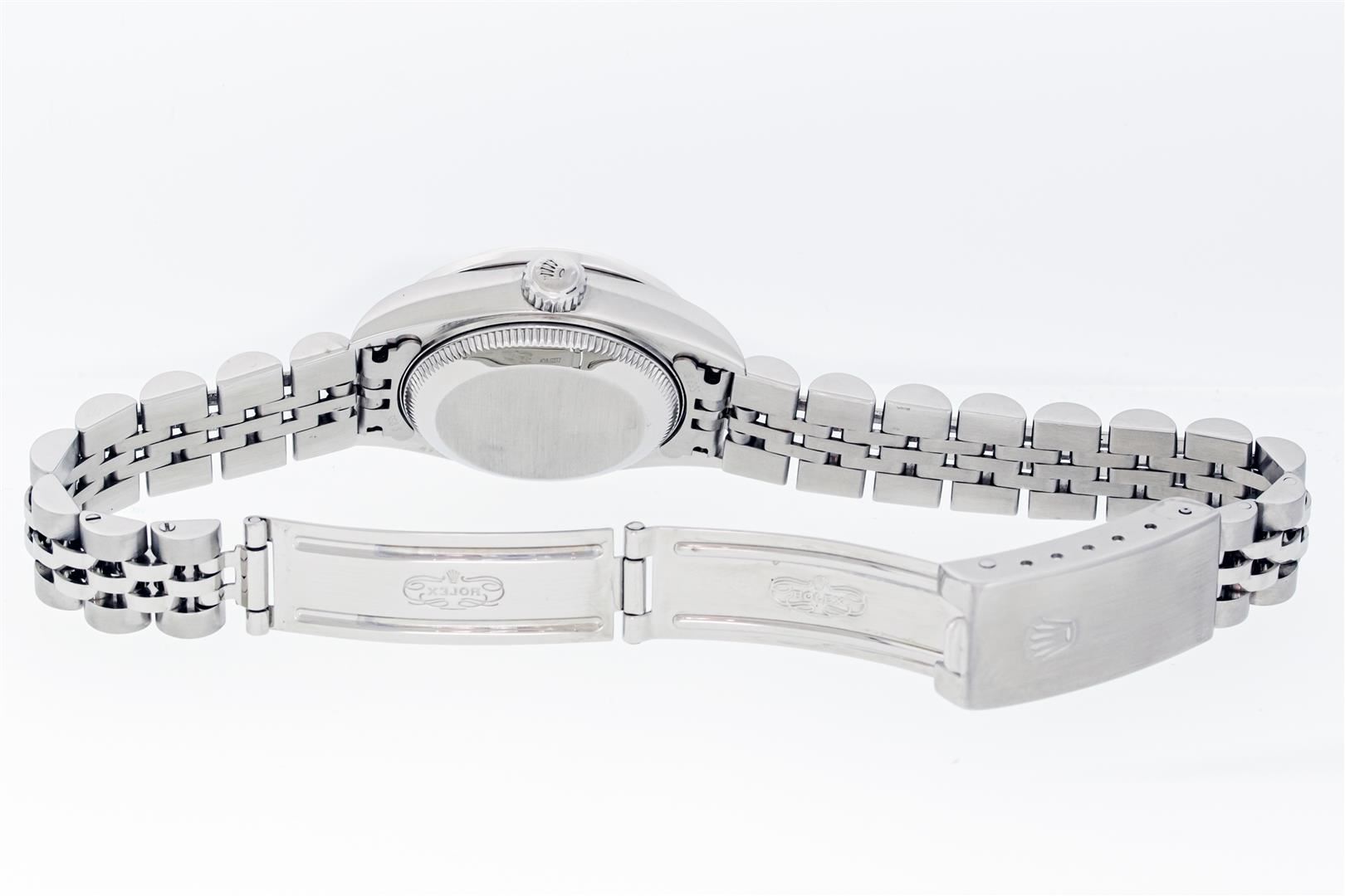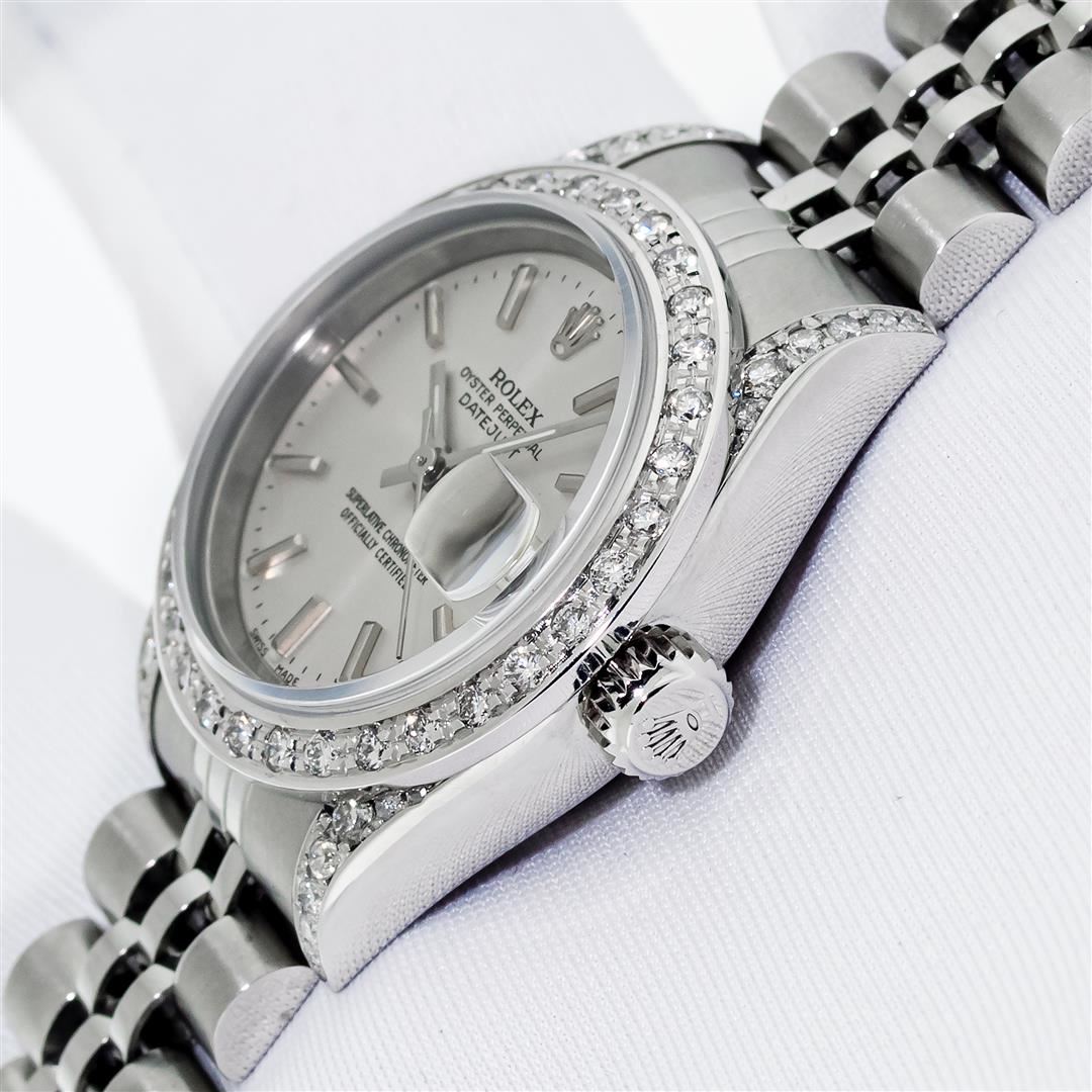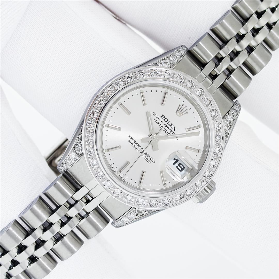 One Ladies Pre Owned Quickset Stainless Steel Rolex Datejust Polished Bright with Satin Finish, Serviced & Electronically Tested, Stainless Steel Case: 26mm, Custom Diamond Lugs: Added Diamonds On Lugs, Diamond Count: 24 Diamonds On Lugs. Rolex Stainless Steel Crown, Custom Bezel: New 18K White Gold Beadset Diamond Bezel, Diamond Count: 32 Diamonds On Bezel. Custom Crystal: New Sapphire With Magnified Date Window. Custom Hands: New Hands. Rolex Movement: Automatic Winding Movement 2235. Rolex Dial: Silver Index With Dash Track & Lumi Dots. Date Window: 3 O'Clock Position Date Display, Model: Quickset Datejust. Condition: G-6 Extra Fine. Rolex Bracelet: Stainless Steel Jubilee Band. Bright Polish & Satin Finish. 6.0 Inch Length, Adjustable. Standard Clasp, With Rolex Logo. This Watch Has Been Serviced Time Tested And Is In Excellent Condition It Is Free Of All Scratches And Dents.