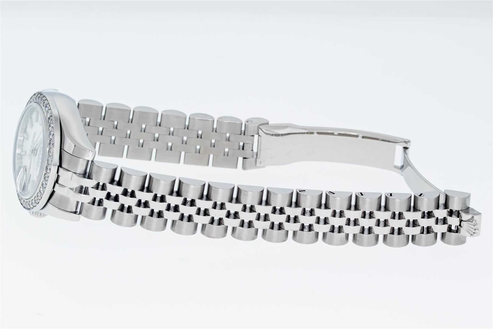 One Ladies Pre Owned Sapphire Quickset Stainless Steel Rolex Datejust Polished Bright with Satin Finish, Serviced & Electronically Tested, Rolex Stainless Steel Case: 26mm, Rolex Stainless Steel Crown, Custom Bezel: New Stainless Steel Beadset Diamond Bezel, Diamond Count: 40 Diamonds On Bezel. Crystal: Sapphire With Magnified Date Window. Hands: Luminescent Hands. Rolex Movement: Automatic Winding Movement 2235. Rolex Dial: White Index With Dash Track. Date Window: 3 O'Clock Position Date Display, Model: Quickset Datejust. Condition: G-6 Extra Fine. Rolex Bracelet: Stainless Steel Jubilee Band. Bright Polish & Satin Finish. 6.0 Inch Length, Adjustable. Hidden Clap, With Rolex Logo. This Watch Has Been Serviced Time Tested And Is In Excellent Condition It Is Free Of All Scratches And Dents.