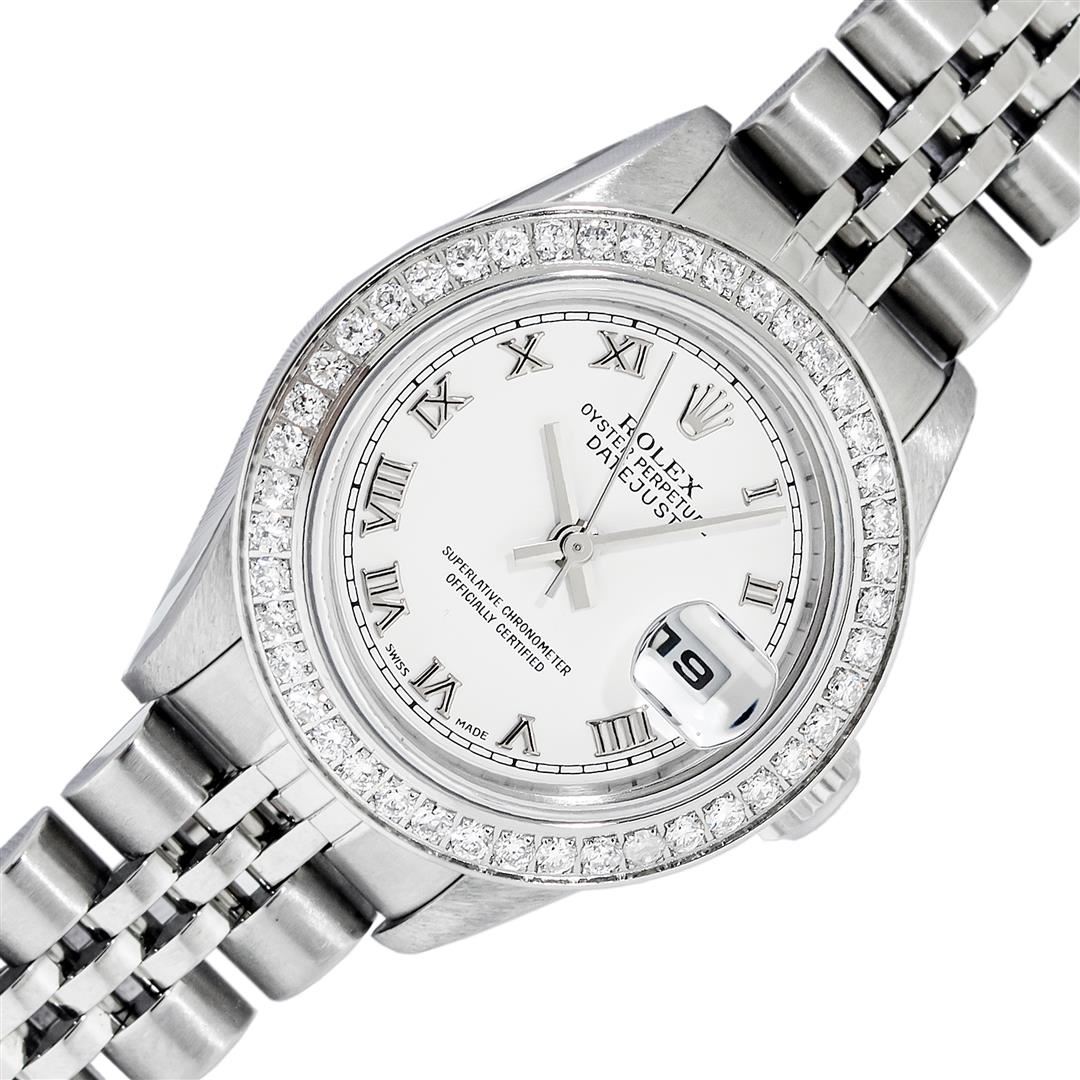 One Ladies Pre Owned Quickset Stainless Steel Rolex Datejust Polished Bright with Satin Finish, Serviced & Electronically Tested, Stainless Steel Case: 26mm, Rolex Stainless Steel Crown, Custom Bezel: New Stainless Steel Diamond Bezel, Diamond Count: 40 Diamonds On Bezel. Custom Crystal: New Sapphire With Magnified Date Window. Custom Hands: New Hands. Rolex Movement: Automatic Winding Quickset Movement 2235. Rolex Dial: White Roman With Square Track. Date Window: 3 O'Clock Position Date Display, Model: Quickset Datejust. Condition: G-6 Extra Fine. Rolex Bracelet: Stainless Steel Jubilee Band. Bright Polish & Satin Finish. 6.0 Inch Length, Adjustable. Standard Clasp, With Rolex Logo. This Watch Has Been Serviced Time Tested And Is In Excellent Condition It Is Free Of All Scratches And Dents.