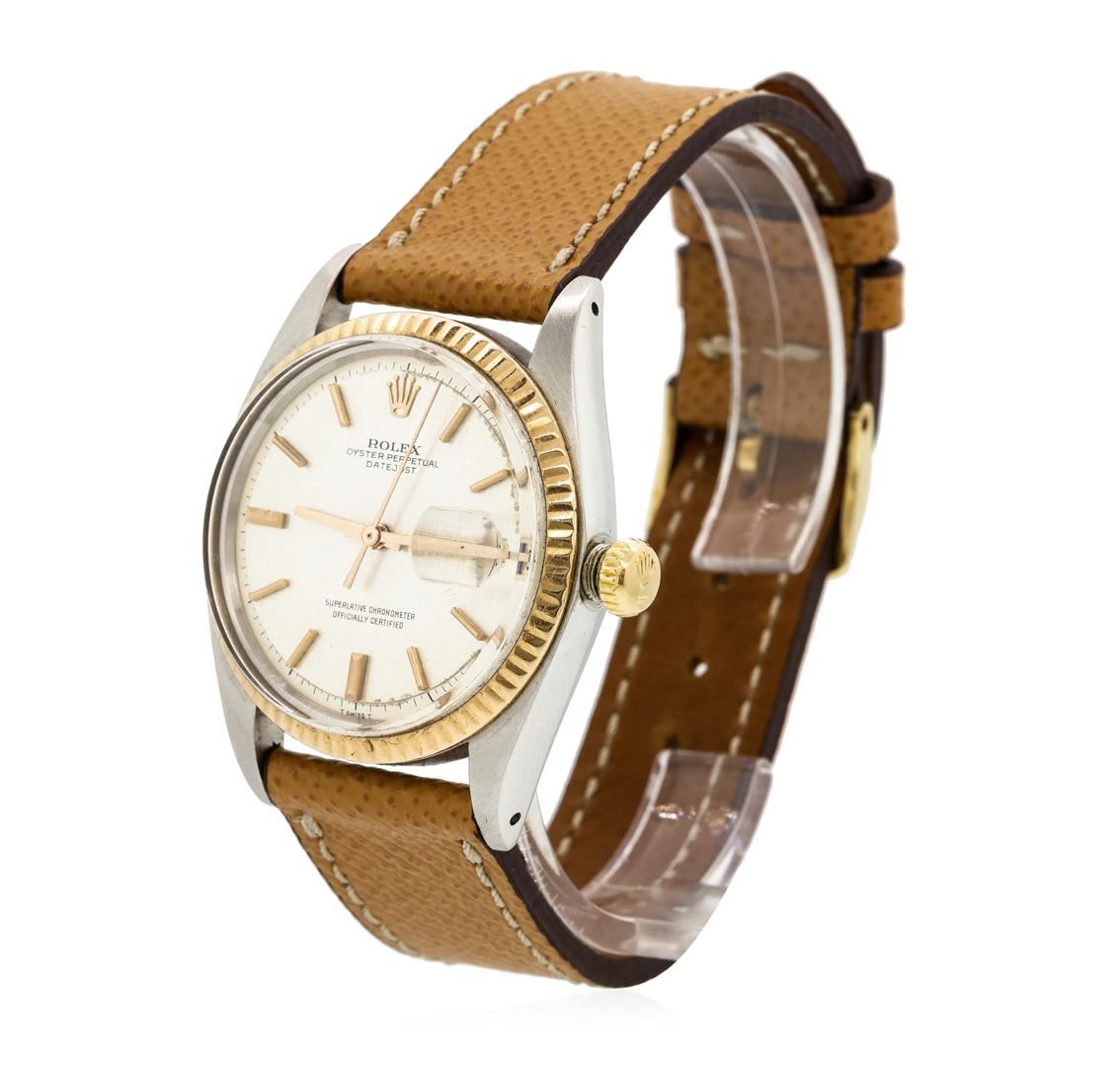One two tone rose gold and stainless steel Rolex men's Oyster Perpetual Datejust wristwatch with a case measuring 36 millimeters. The case has a fluted rose gold bezel with a brushed silver dial with rose tone stick markers and baton type hands and a date